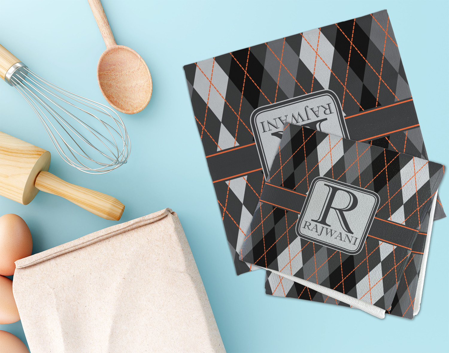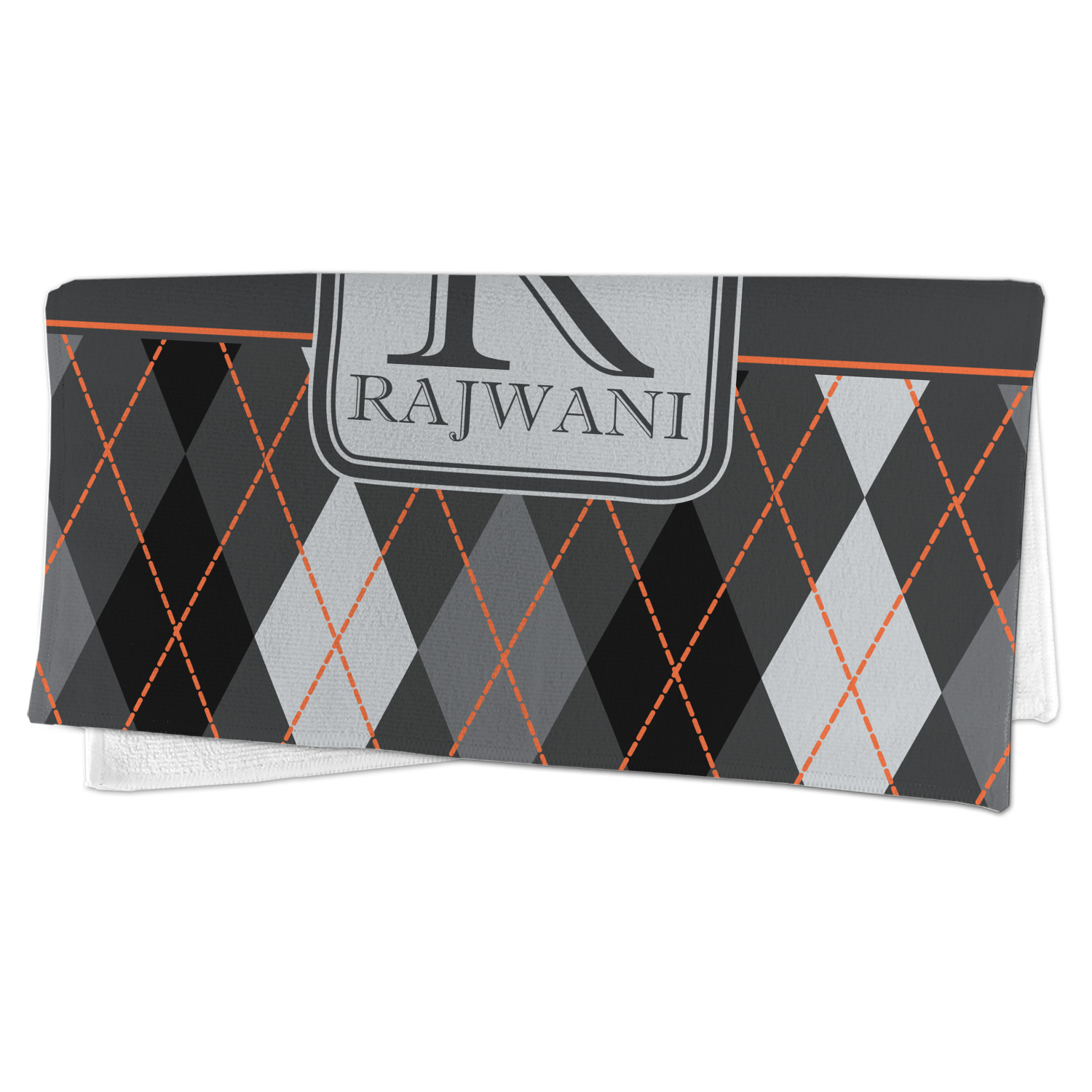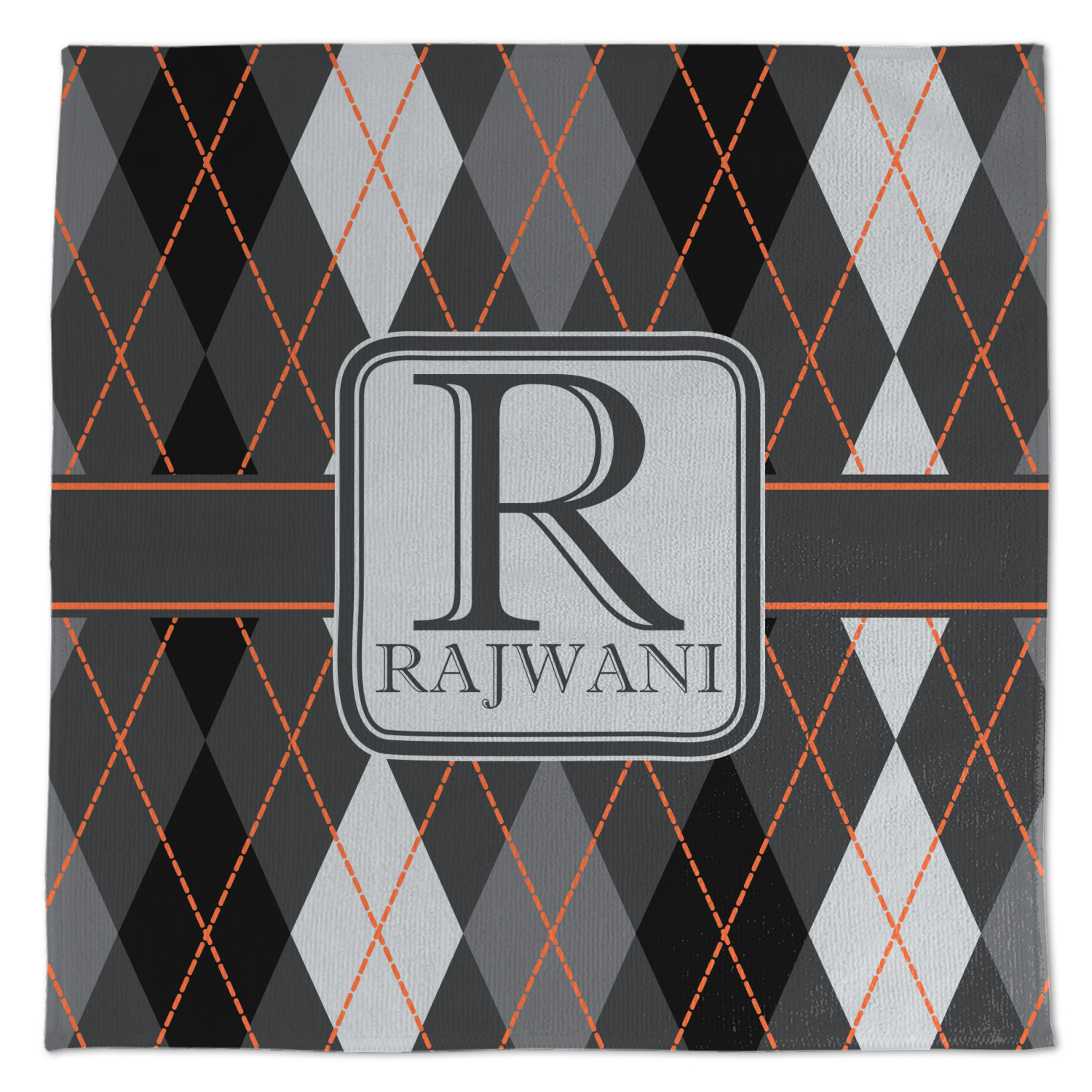 A wide charcoal gray band trimmed in orange divides the pattern to add interested and is used to highlight the slate grey square label. Add personalization of your choice.
