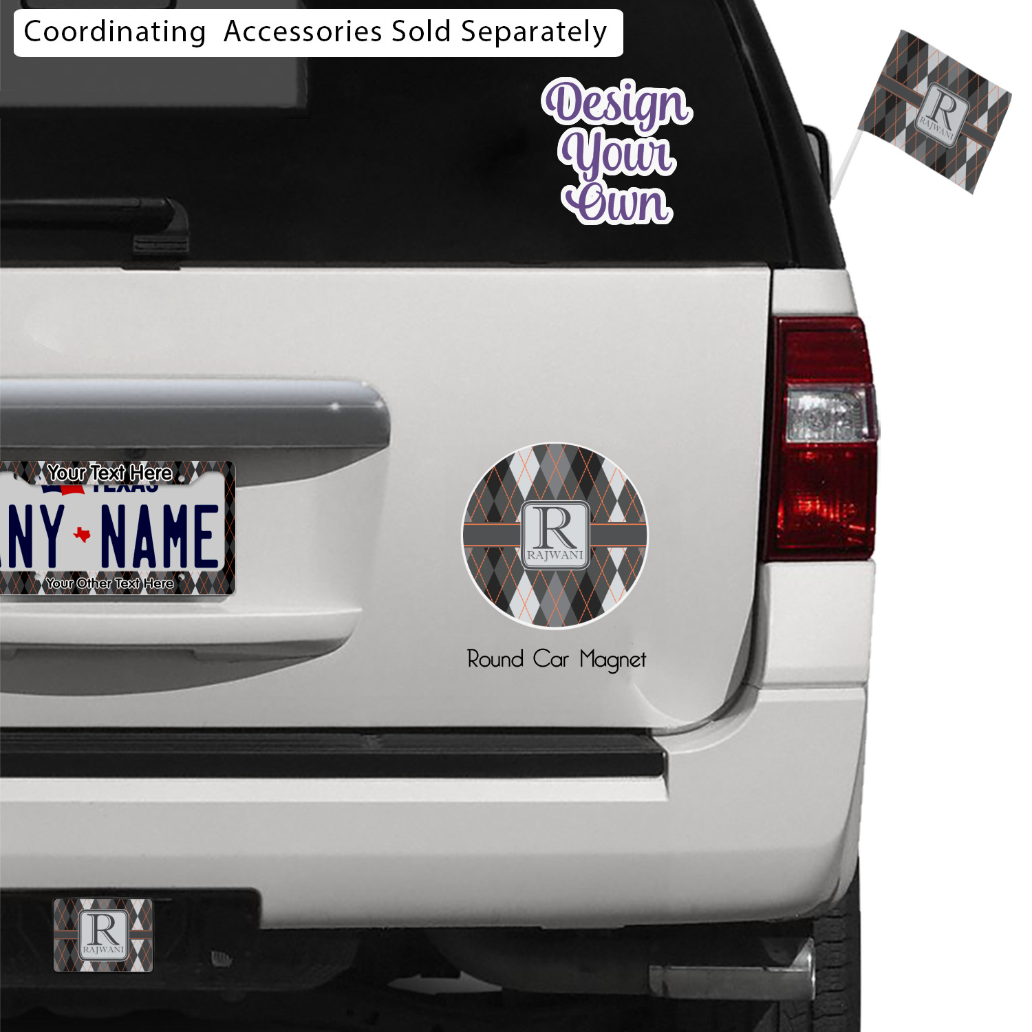 A wide charcoal gray band trimmed in orange divides the pattern to add interested and is used to highlight the slate grey square label. Add personalization of your choice.