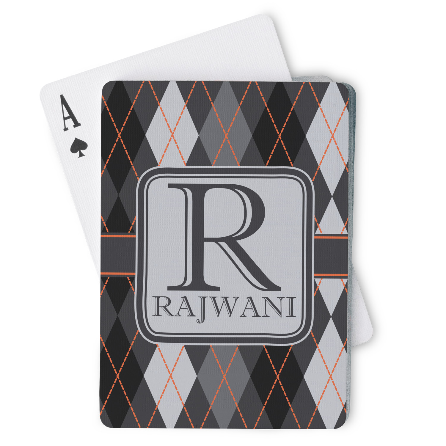 The customization / personalization is printed on the back side. The playing cards have a low gloss coating on both sides. The cards are packaged in a clear plastic box.