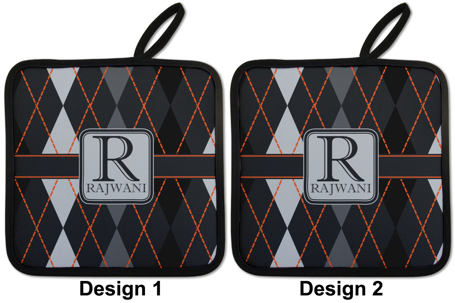 Our personalized pot holders feature a neoprene front that displays your personalization in vibrant colors. The backing of the hot pot holder is rubberized; the textured backing allows you to have a great grip when using this custom pot holder. The two materials are joined with a sleek, black trim, and the holder also includes an attached loop for hanging and storage. The pot holder is approximately 8.75 inches by 8.75 inches and 0.25 inches tall, while the fabric loop is 2.5 inches long. You can purchase a kitchen pot holder by itself or as a set of 2. We also offer a set including one pot holder and one oven mitt.