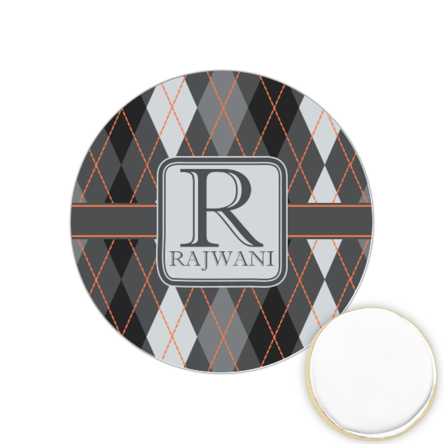 A wide charcoal gray band trimmed in orange divides the pattern to add interested and is used to highlight the slate grey square label. Add personalization of your choice.