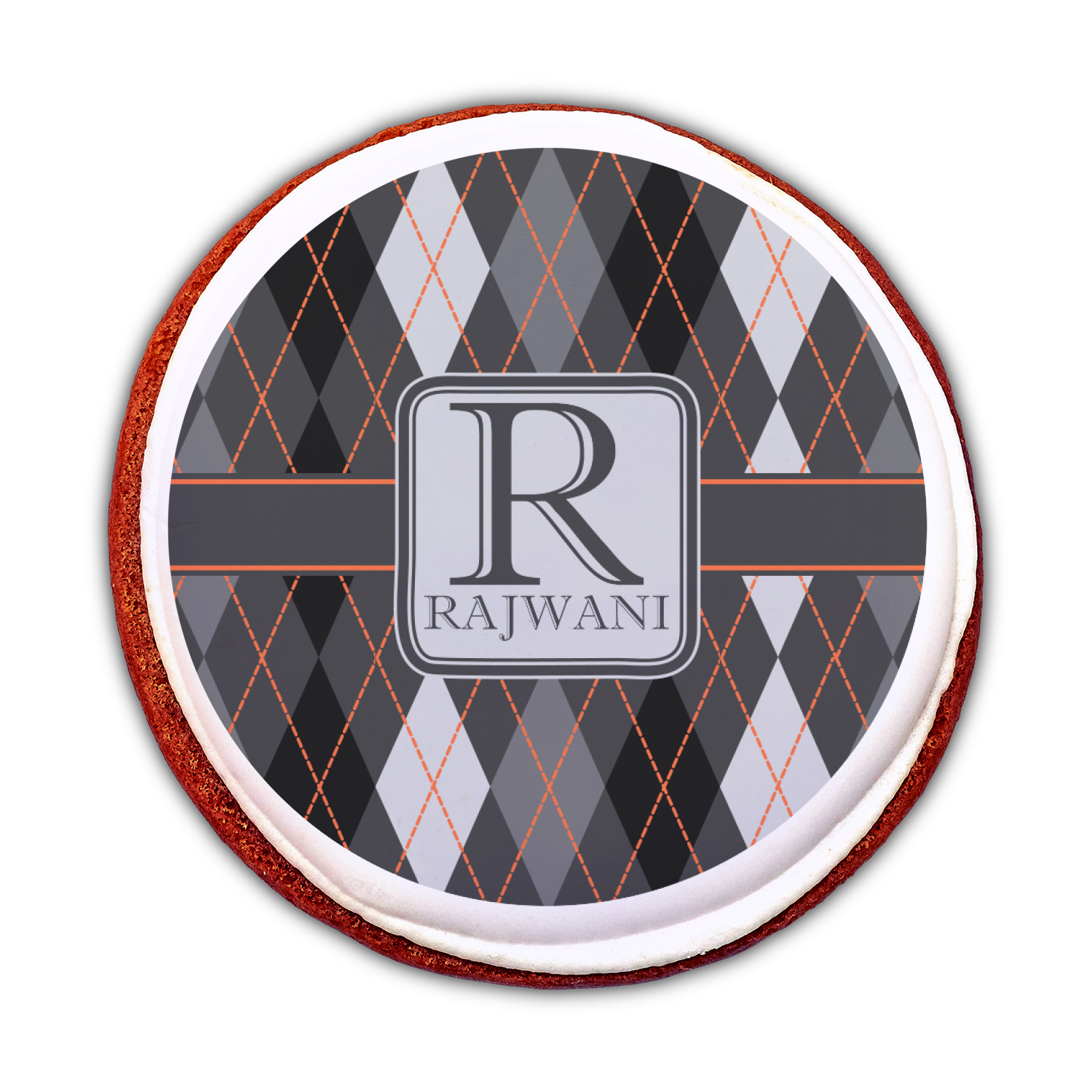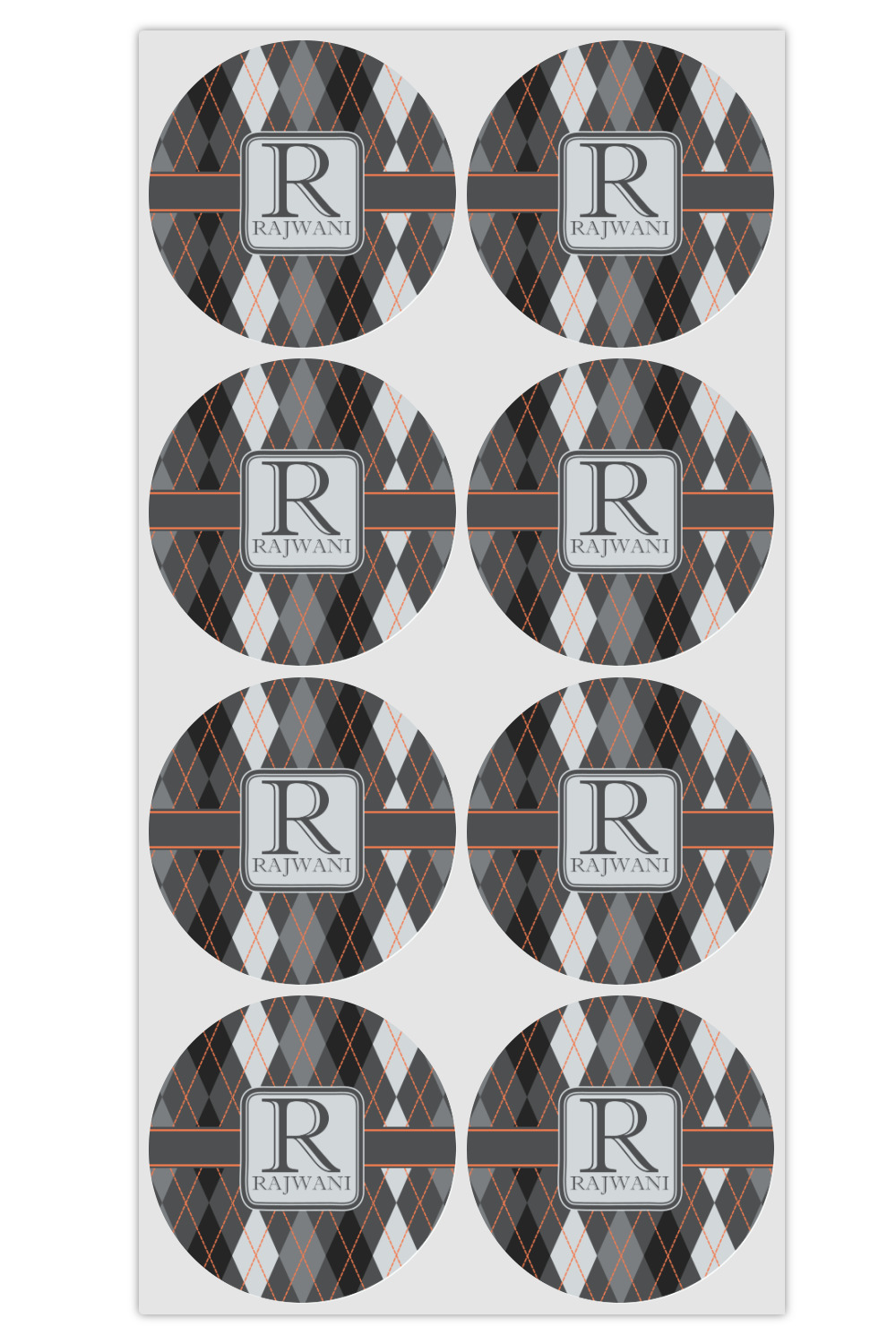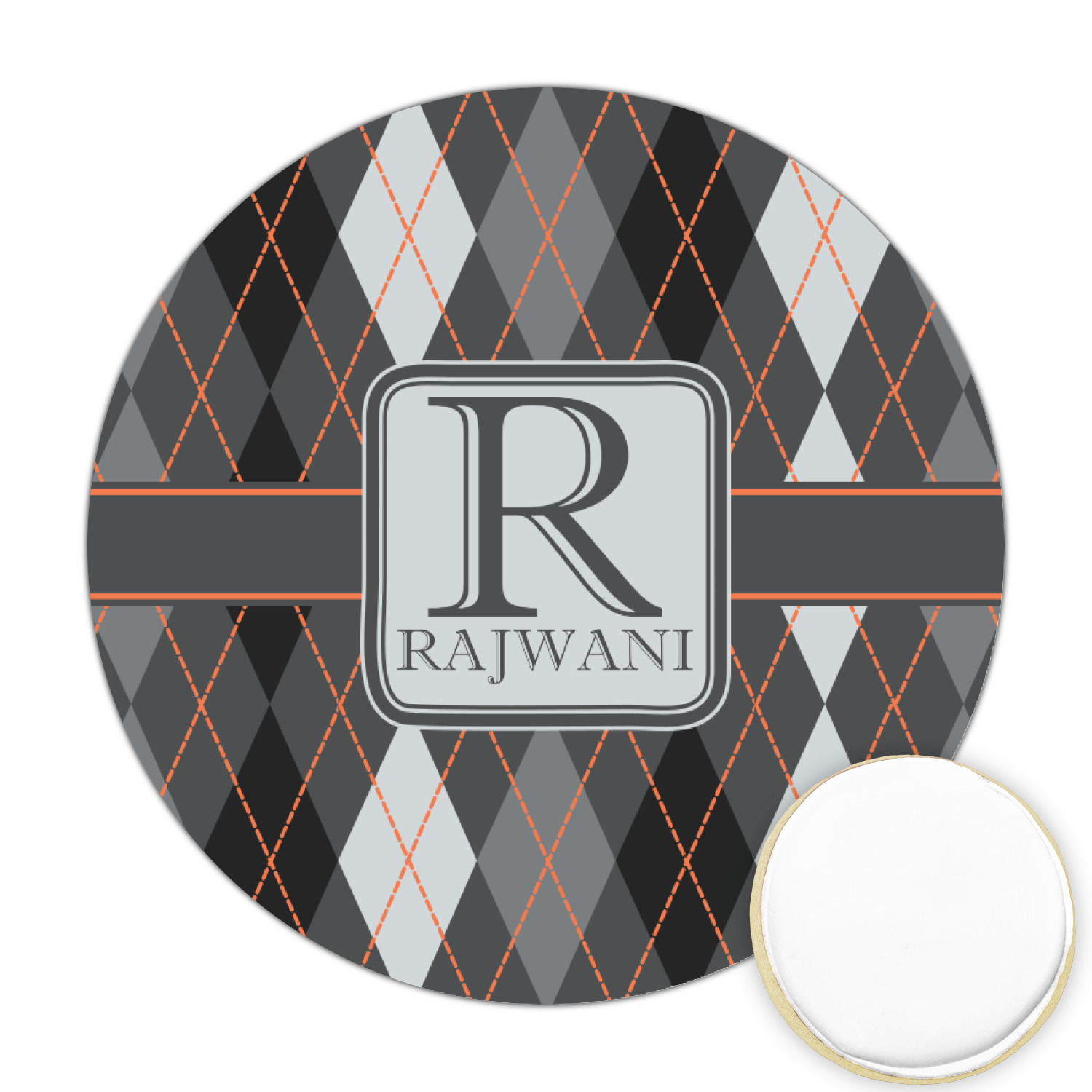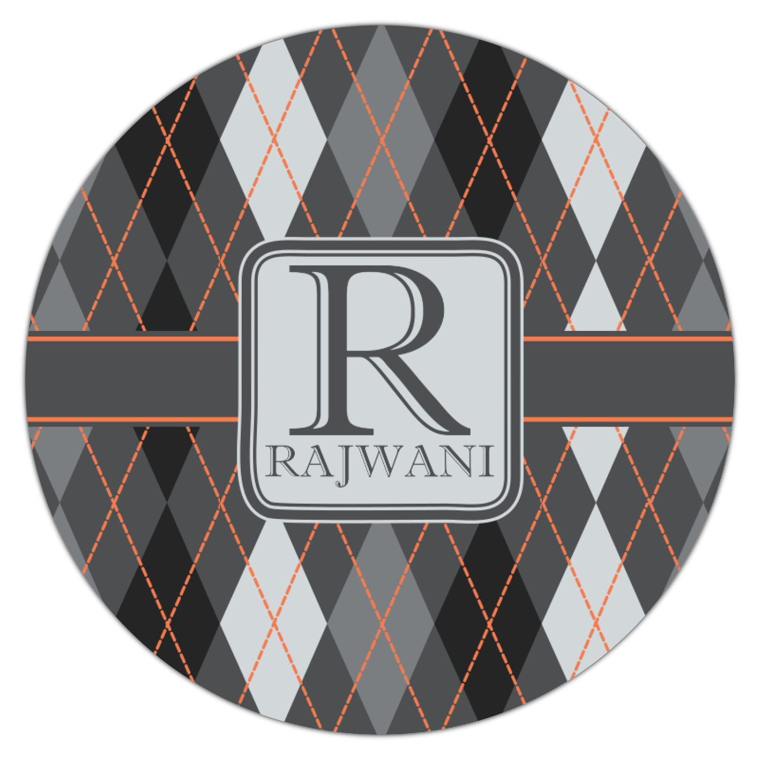 A wide charcoal gray band trimmed in orange divides the pattern to add interested and is used to highlight the slate grey square label. Add personalization of your choice.