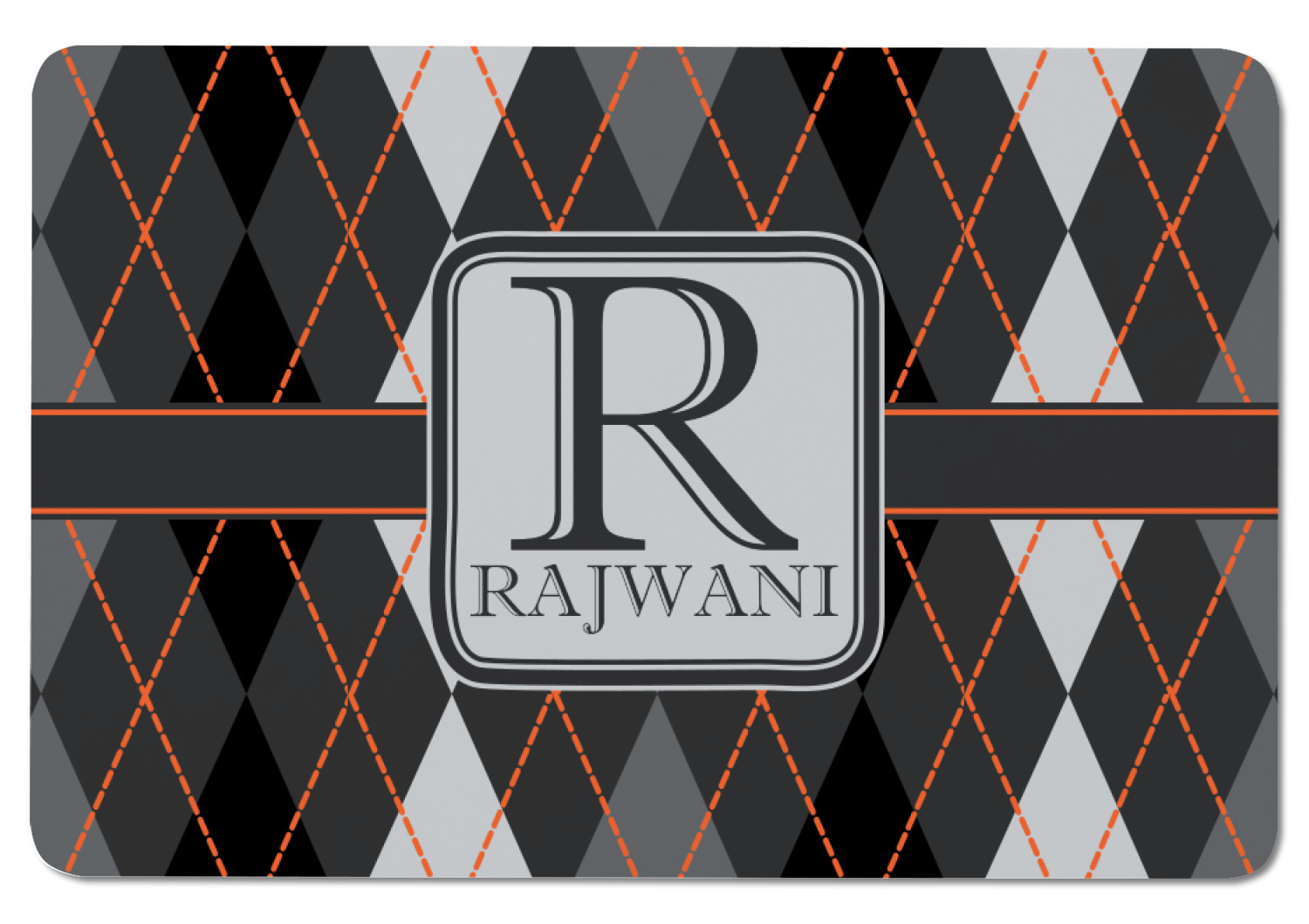 A wide charcoal gray band trimmed in orange divides the pattern to add interested and is used to highlight the slate grey square label. Add personalization of your choice.