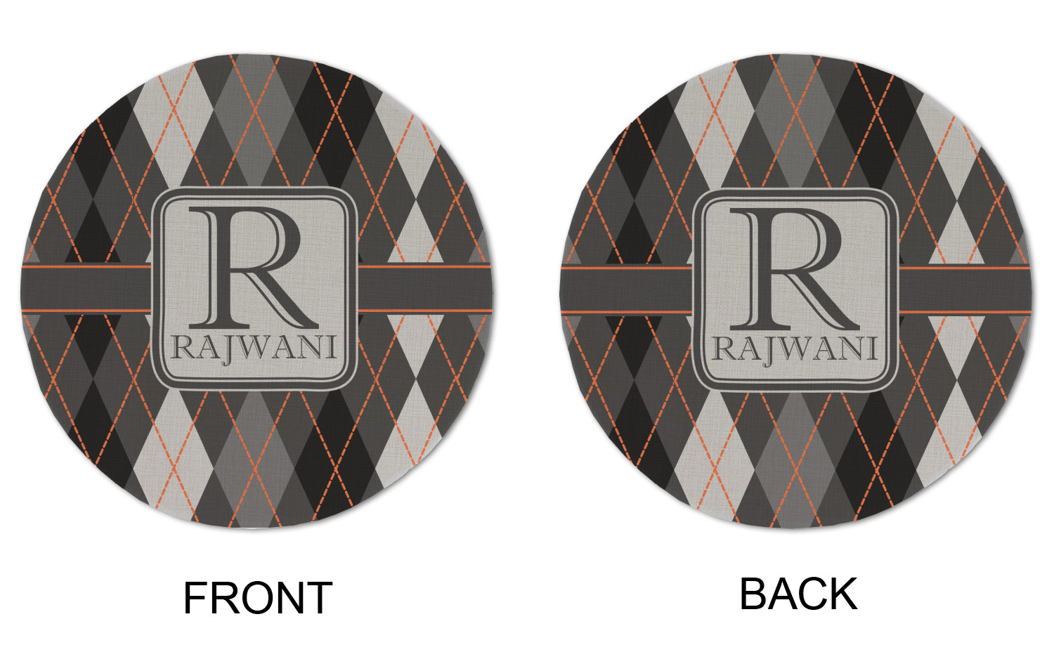 A wide charcoal gray band trimmed in orange divides the pattern to add interested and is used to highlight the slate grey square label. Add personalization of your choice.