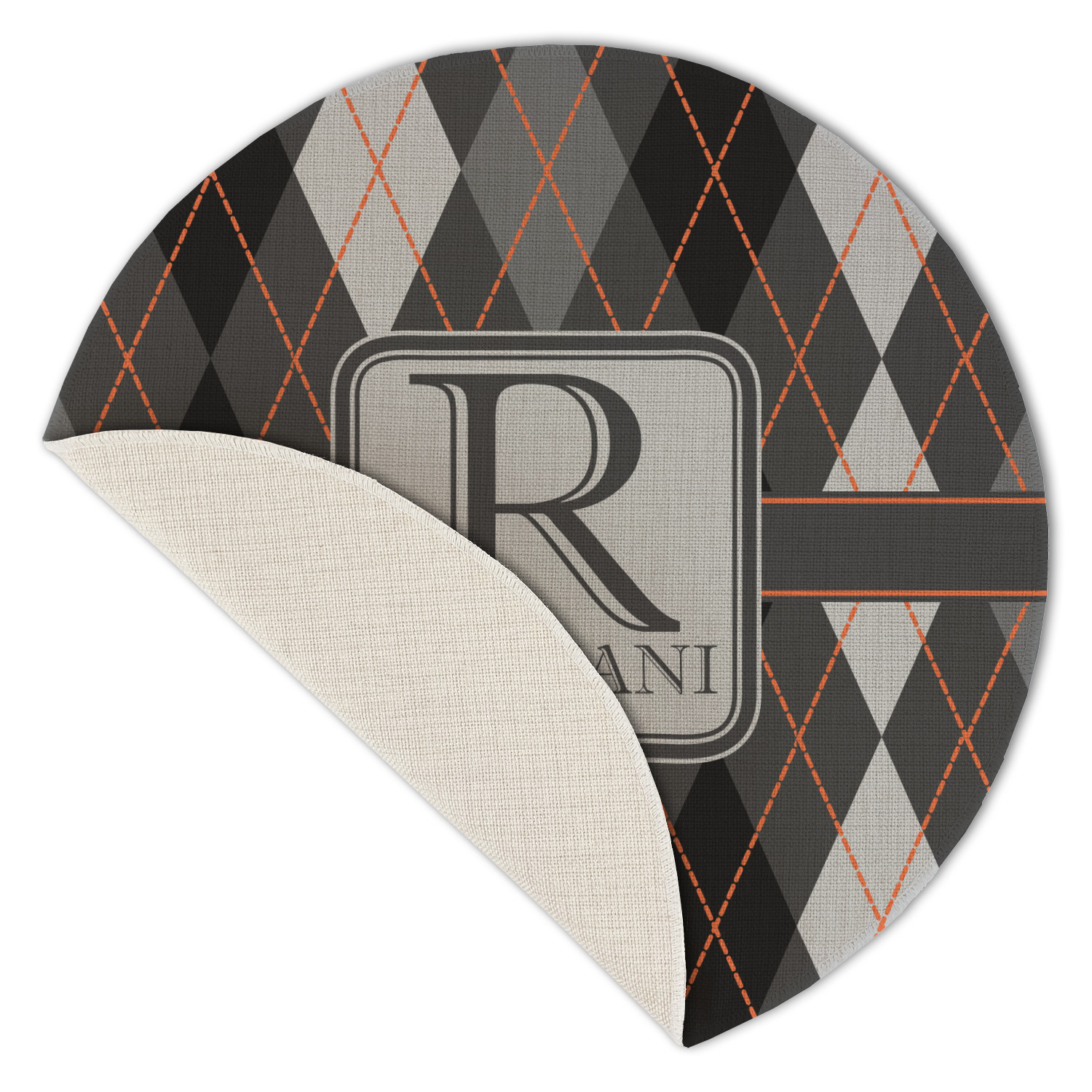 A wide charcoal gray band trimmed in orange divides the pattern to add interested and is used to highlight the slate grey square label. Add personalization of your choice.