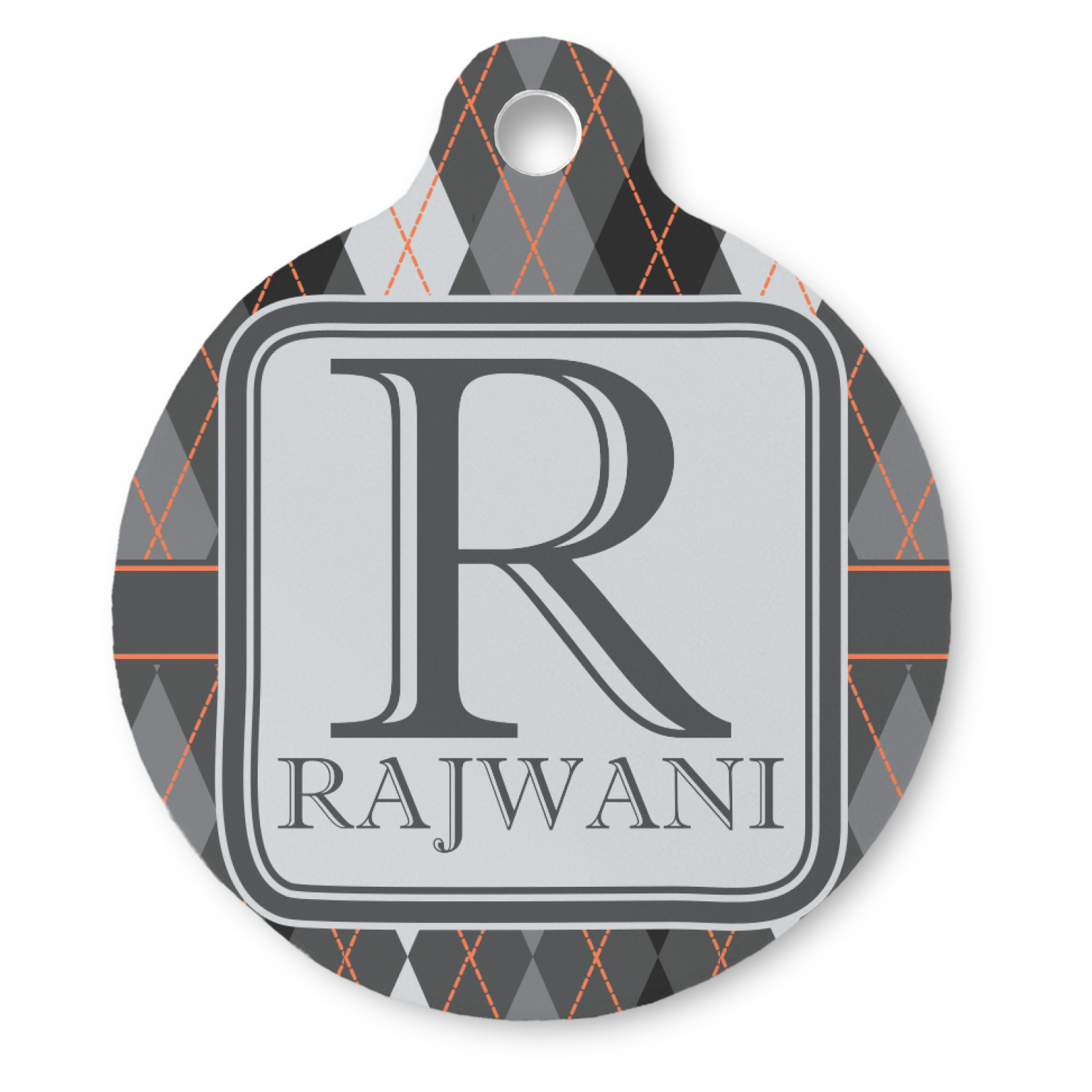 A wide charcoal gray band trimmed in orange divides the pattern to add interested and is used to highlight the slate grey square label. Add personalization of your choice.