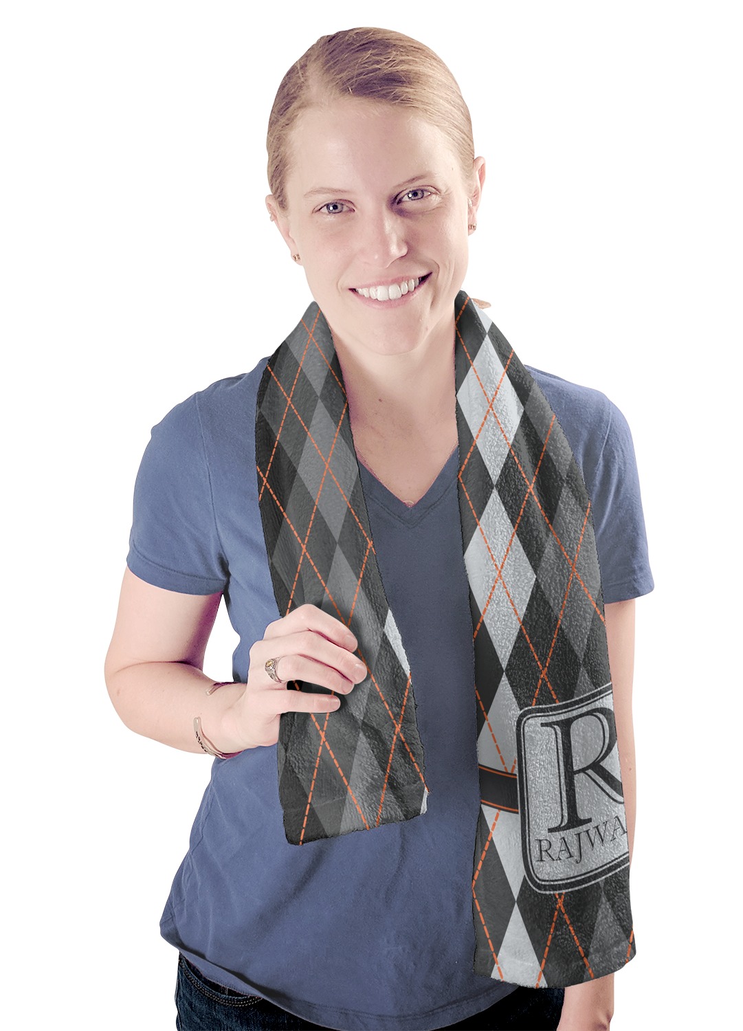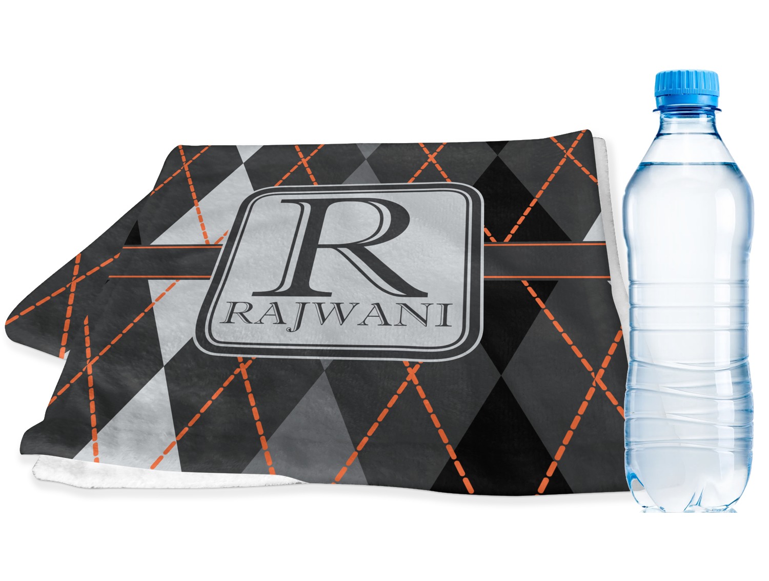 A wide charcoal gray band trimmed in orange divides the pattern to add interested and is used to highlight the slate grey square label. Add personalization of your choice.