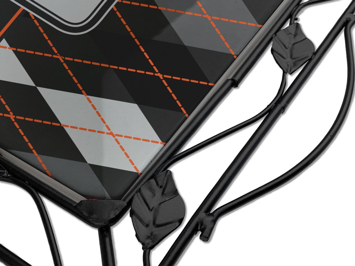 Monochromatic with a pop of color. This gorgeous harlequin pattern made from shades of gray creates the perfect backdrop to showcase the bold lines of orange. The design can go with just about anything. The grays will blend with any color and the orange will not overpower your design choices.