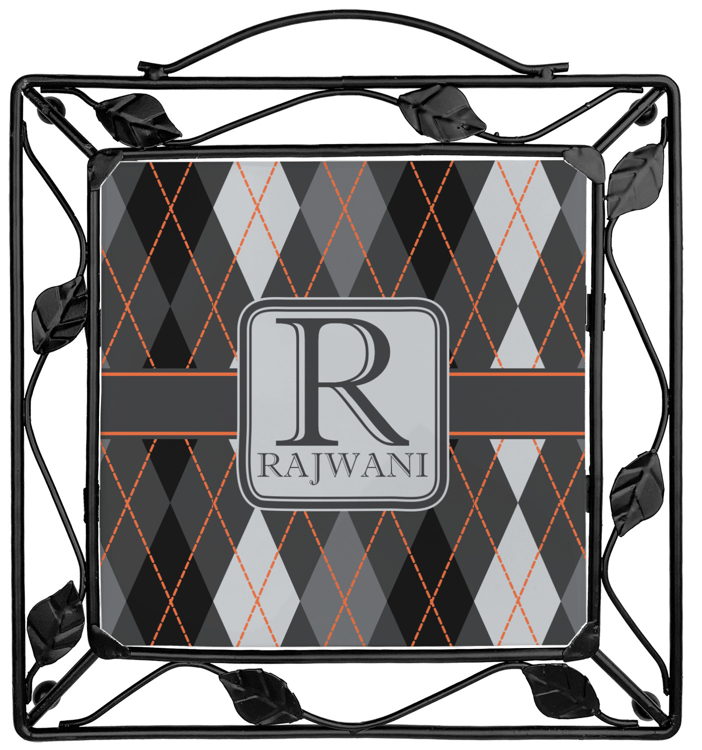 Our square trivets are made from a durable, wrought iron. This model features 4 small half circles, one on each corner, and a larger ring of iron that circles the central, customized tile. Each of the 4 corners has a round foot on its bottom for stability. This trivet is 8.75 by 8.75 inches, but the central tile measures at 6 inches on both sides.