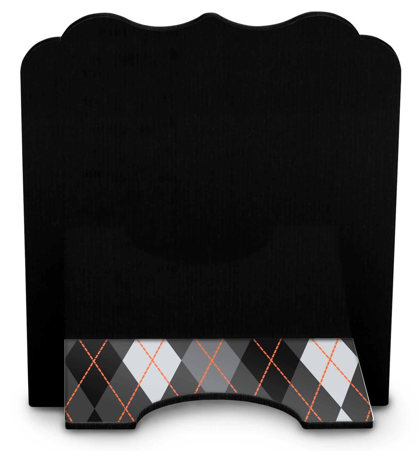 The stand is comprised of two hardboard pieces that fit snugly together and stabilize one another. The bottom part of the iPad stand supports your tablet, and has space for your tablets charger while in use. At 9.25" x 11.5", this tablet mount can support a device between the sizes of the iPad Pro and the iPad Mini 2. The uppermost part of the stand features a decorative, curved edge for a classy, suave appearance. We print your customization atop the face of the stand, in vibrant color. The remaining sides are colored a sleek black.