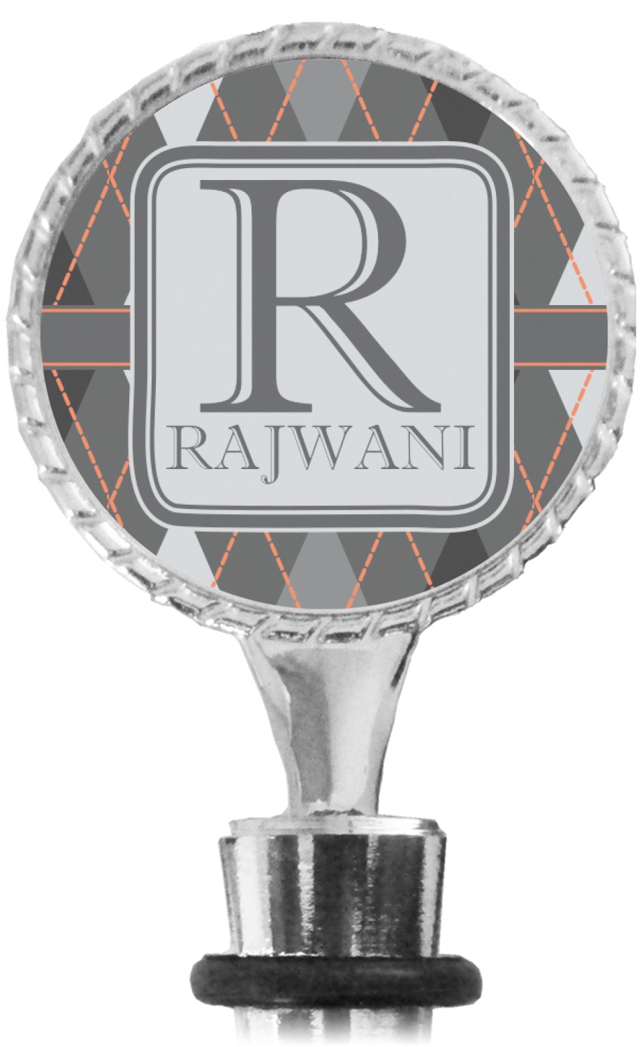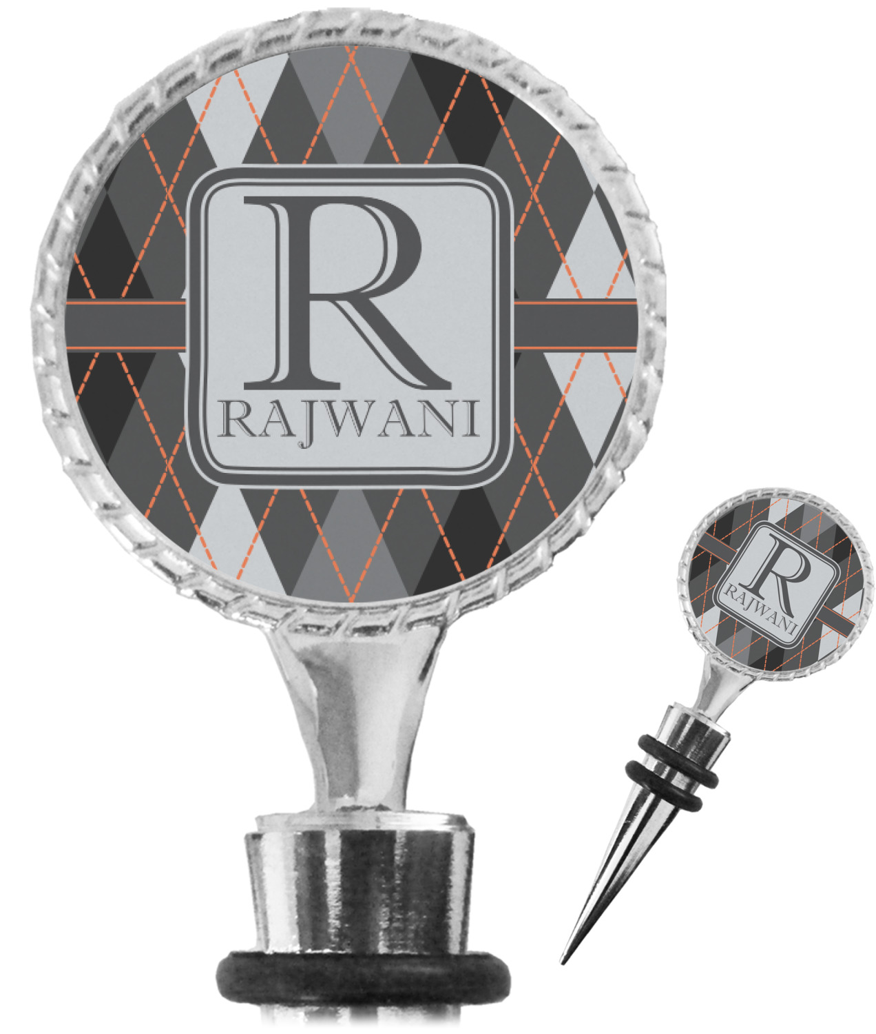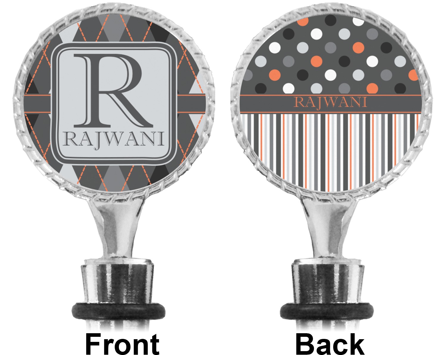 The top part of your bottle stopper is comprised of a zinc ring that displays your customization(s) in its middle, on both sides. The ring is heavy duty, with a bright chrome finish. The body of the wine stoppers have two silicone rings to provide an airtight seal. These wine bottle stoppers measure at 1.625" L x 0.8125" W x 4.625" H; your custom wine stopper is meant to fit into most standard-sized wine bottles.