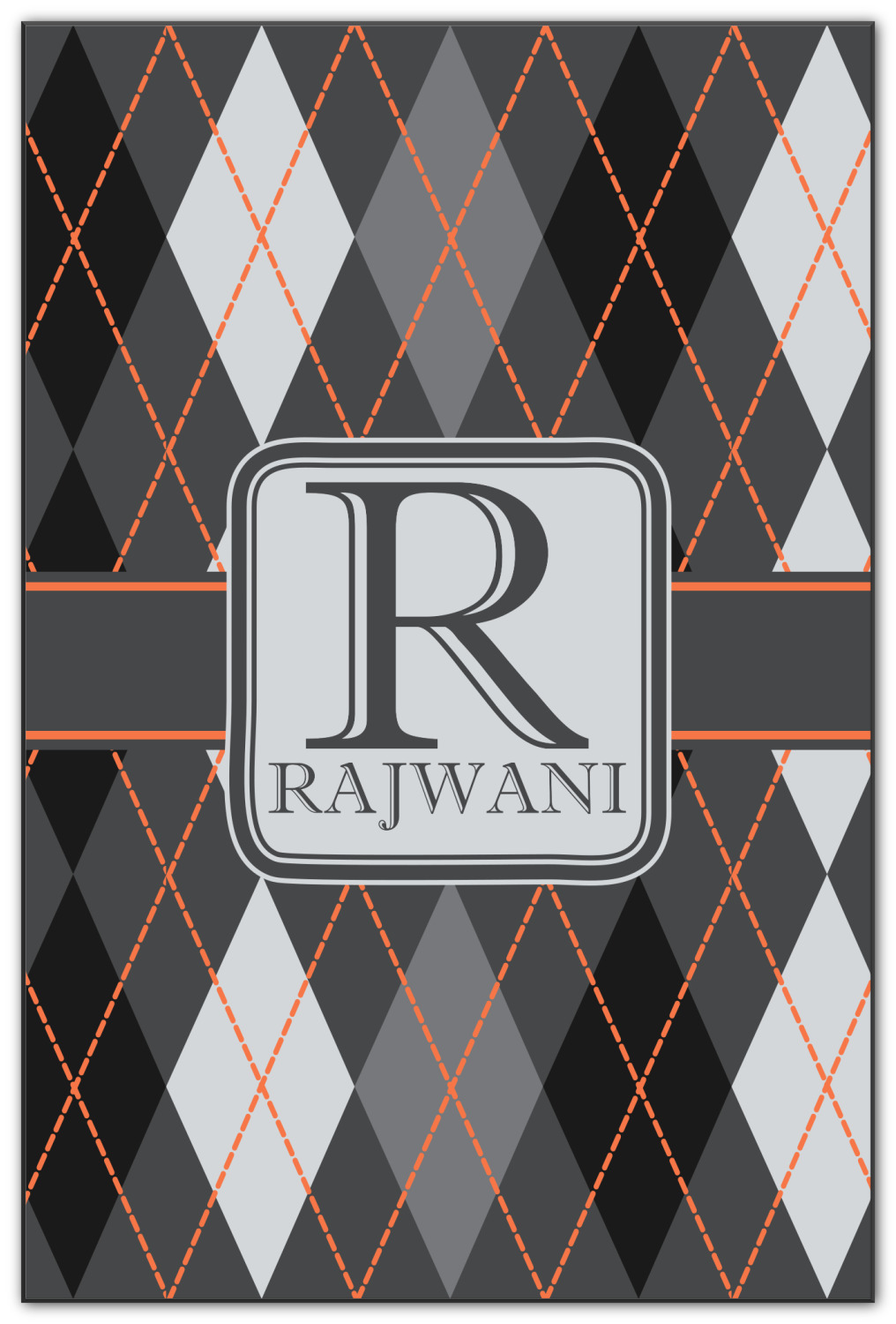 A wide charcoal gray band trimmed in orange divides the pattern to add interested and is used to highlight the slate grey square label. Add personalization of your choice.