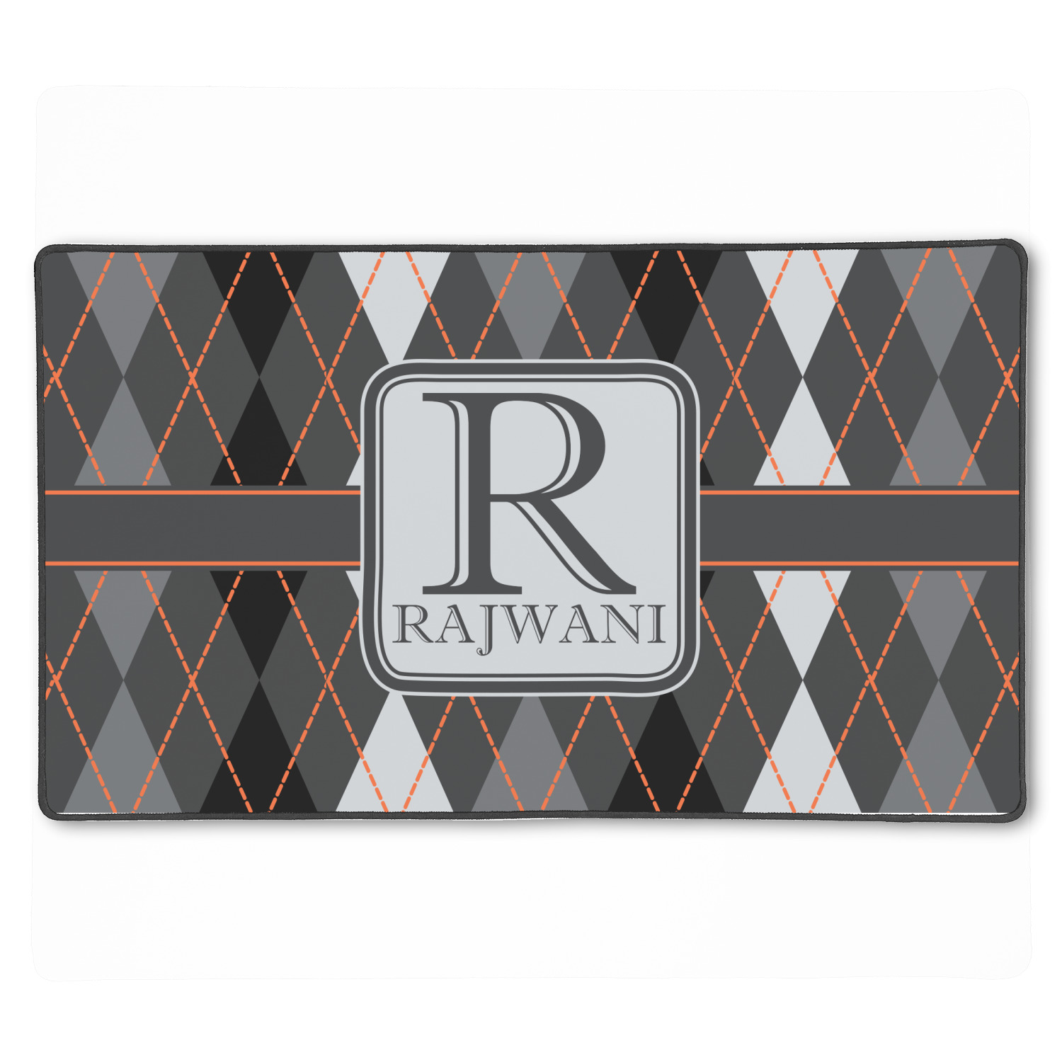 A wide charcoal gray band trimmed in orange divides the pattern to add interested and is used to highlight the slate grey square label. Add personalization of your choice.