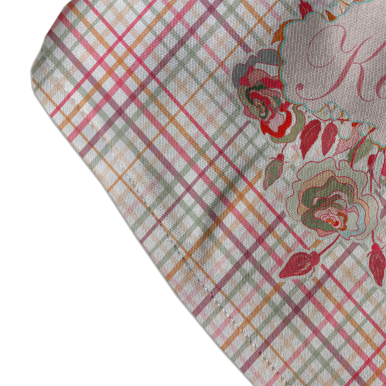 To make it really feminine, we chose a matching floral label that coordinates perfectly with the modern plaid. We chose to use a name personalization in our crown jewels font. We think this is a beautiful elegant design.