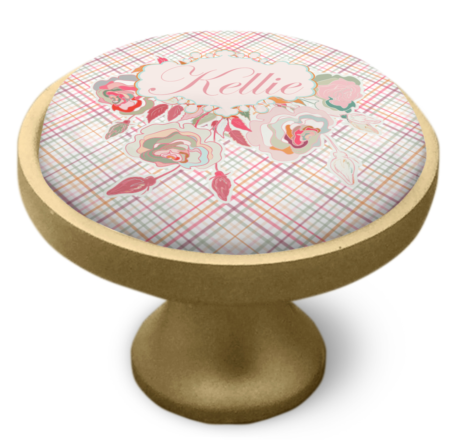 To make it really feminine, we chose a matching floral label that coordinates perfectly with the modern plaid. We chose to use a name personalization in our crown jewels font. We think this is a beautiful elegant design.