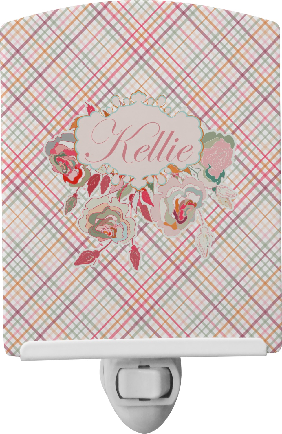 To make it really feminine, we chose a matching floral label that coordinates perfectly with the modern plaid. We chose to use a name personalization in our crown jewels font. We think this is a beautiful elegant design.