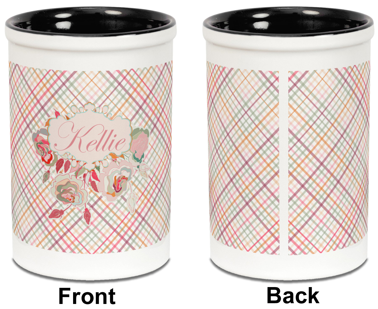 To make it really feminine, we chose a matching floral label that coordinates perfectly with the modern plaid. We chose to use a name personalization in our crown jewels font. We think this is a beautiful elegant design.