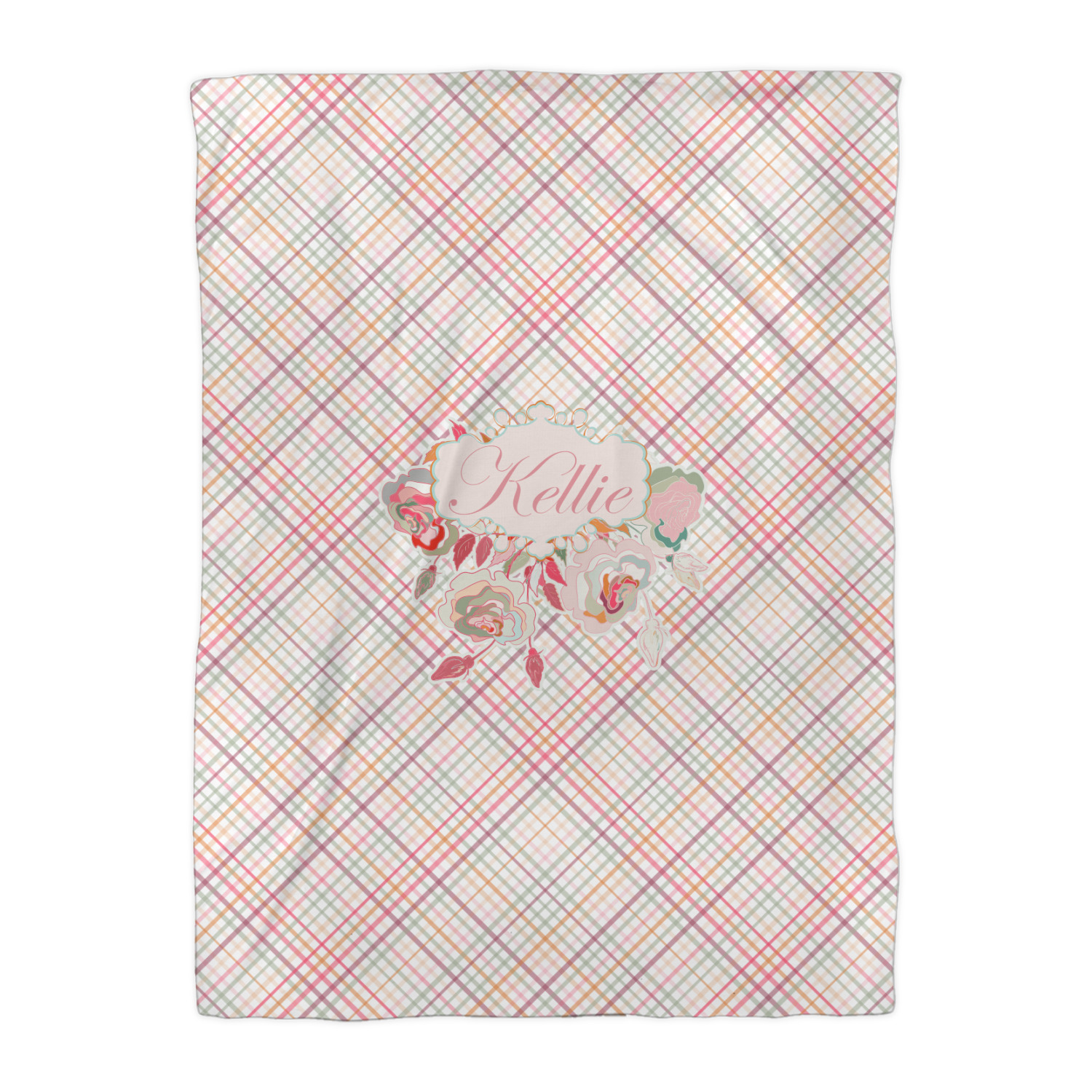 To make it really feminine, we chose a matching floral label that coordinates perfectly with the modern plaid. We chose to use a name personalization in our crown jewels font. We think this is a beautiful elegant design.