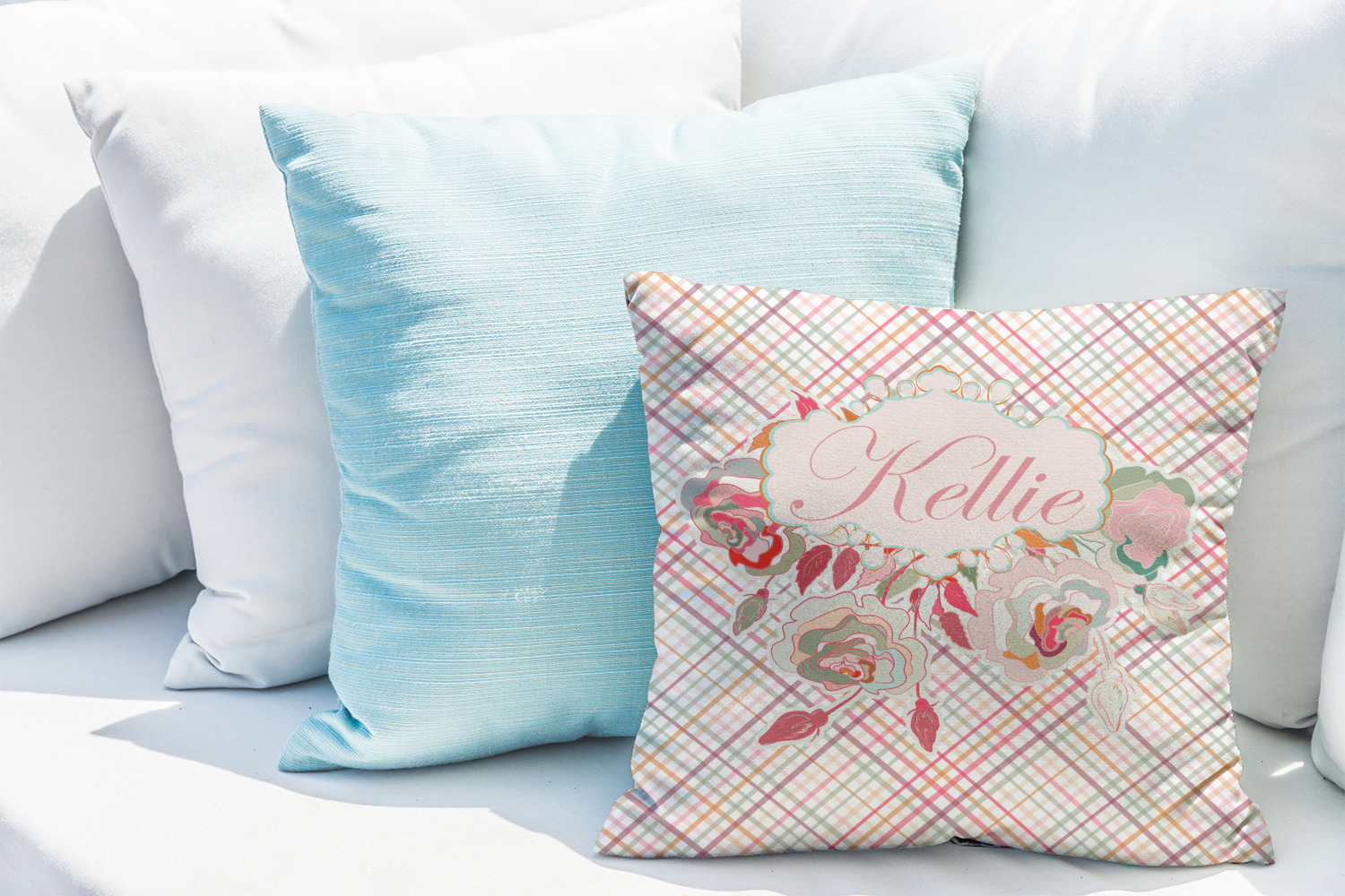 To make it really feminine, we chose a matching floral label that coordinates perfectly with the modern plaid. We chose to use a name personalization in our crown jewels font. We think this is a beautiful elegant design.