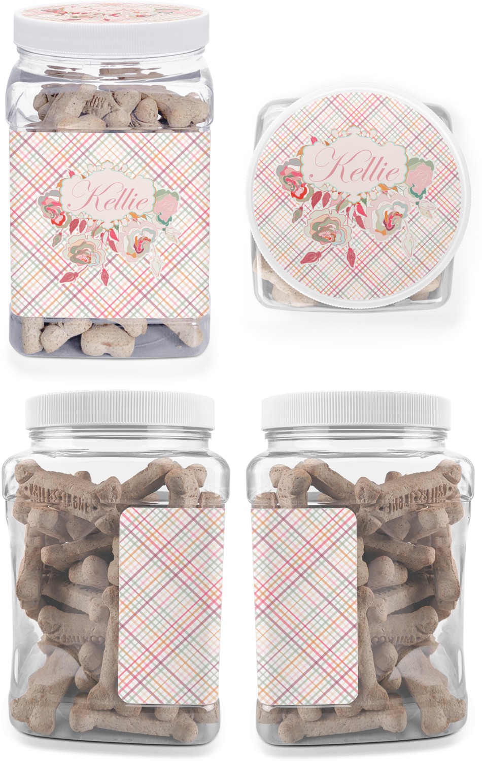 This half gallon jar, made from a sturdy plastic, is the perfect way to keep treats from any naughty pet paws, while still keeping them ready on hand for when your pup performs an impressive trick. This dog cookie jar features a screw-on, white lid that displays your personalized design on a vinyl sticker. We apply another customized sticker that wraps around the front and sides of the jar. Our dog treat jar also has indentations on the rear ends of the sides, which allows for convenient handling, and its square frame allows for easy storage.