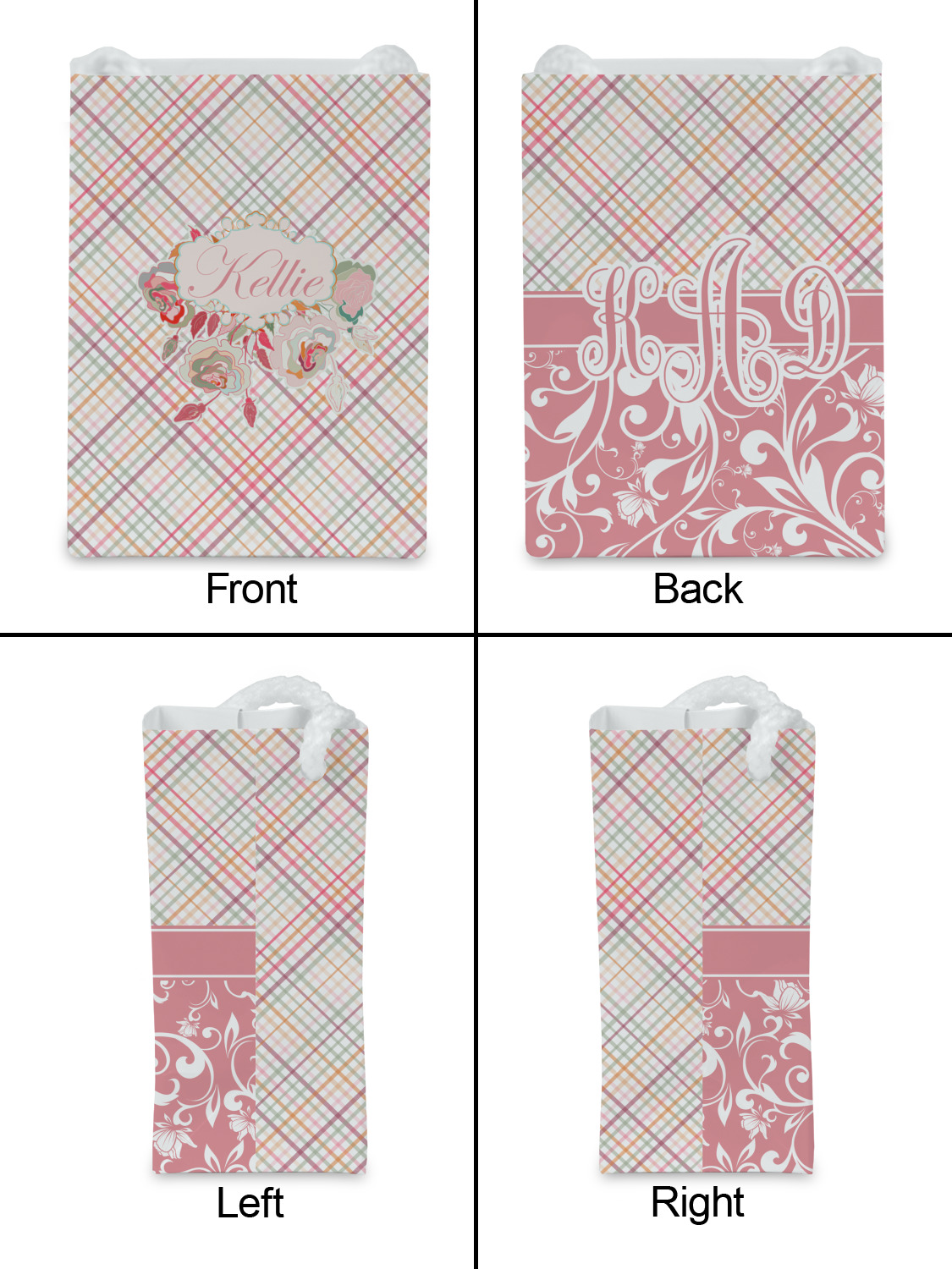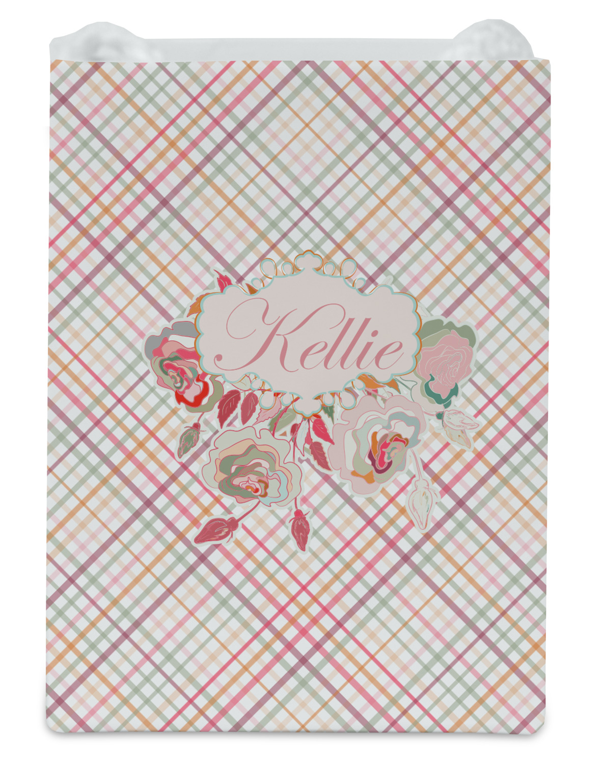 To make it really feminine, we chose a matching floral label that coordinates perfectly with the modern plaid. We chose to use a name personalization in our crown jewels font. We think this is a beautiful elegant design.