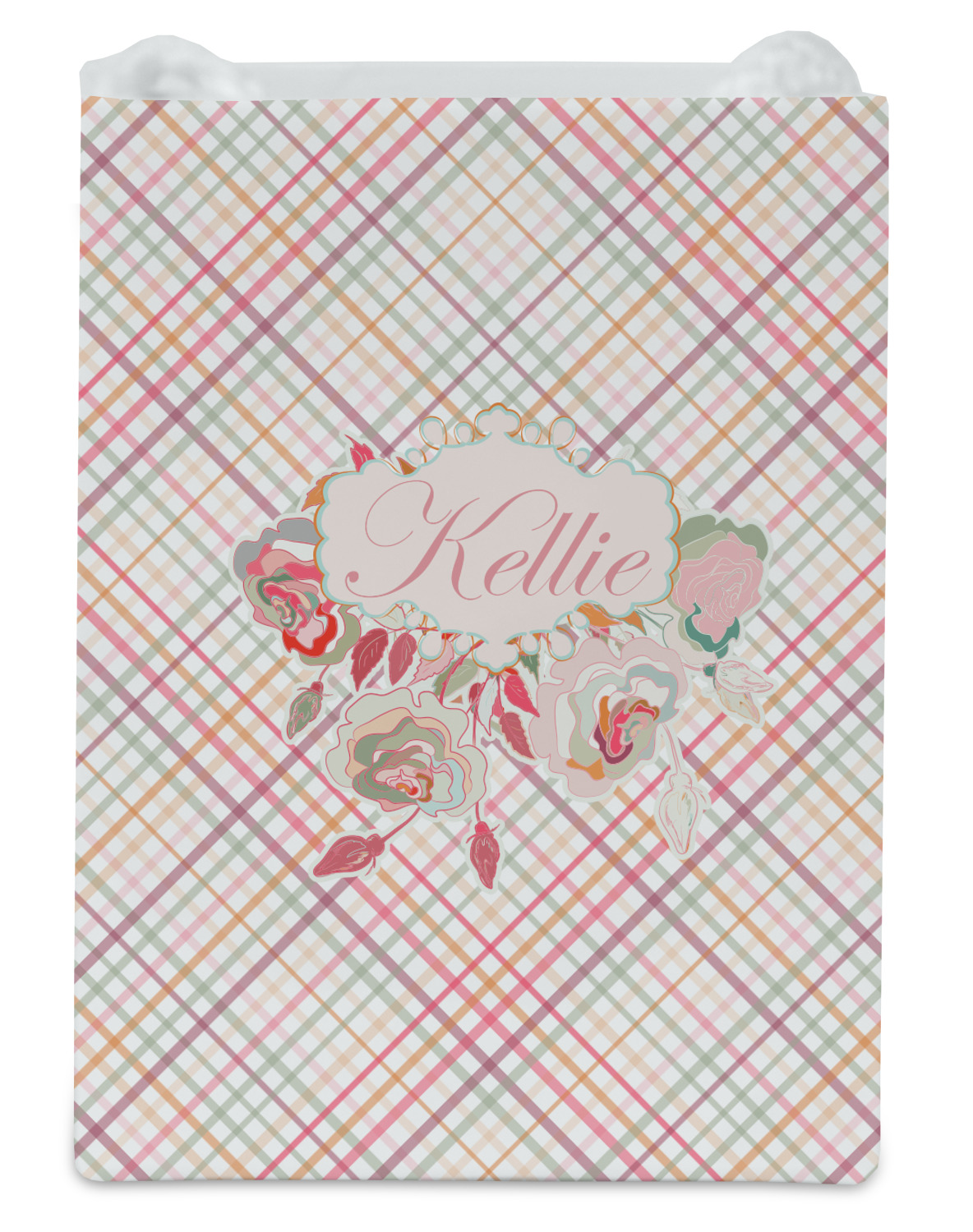 To make it really feminine, we chose a matching floral label that coordinates perfectly with the modern plaid. We chose to use a name personalization in our crown jewels font. We think this is a beautiful elegant design.