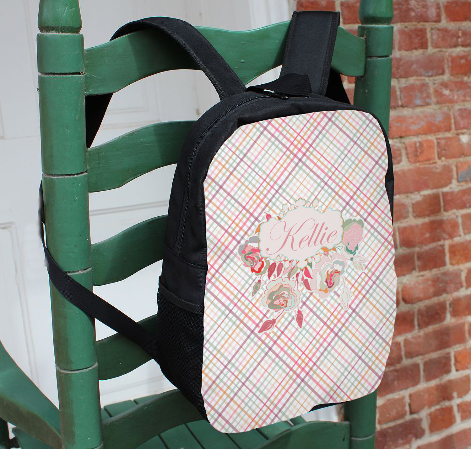 To make it really feminine, we chose a matching floral label that coordinates perfectly with the modern plaid. We chose to use a name personalization in our crown jewels font. We think this is a beautiful elegant design.