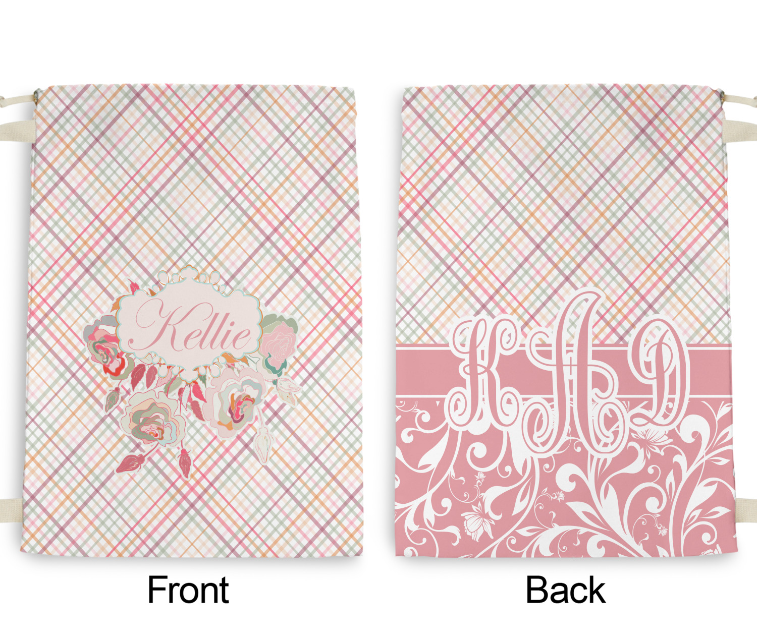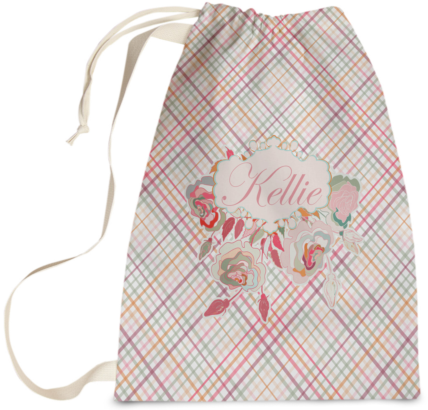Carry your laundry in style with these customized laundry bags. Available in two sizes, featuring a natural colored woven strap and a cinch cord, these bags hold a lot of clothes or anything else you want to fit in them.