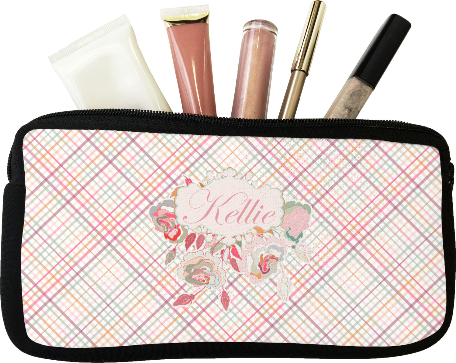 Our personalized makeup bags are available in many different designs, patterns and colors - so you are sure to find one that will love. They are made of neoprene (same material as wet-suits) and thus are water resistant, so spillages in your makeup bag will not end up all over you purse. They are customized on one side and are black on the other side and the zipper is black as well.