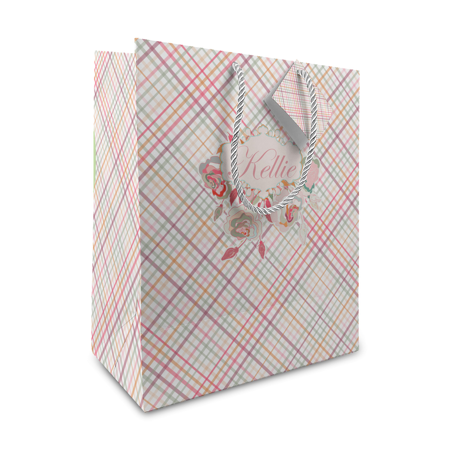 To make it really feminine, we chose a matching floral label that coordinates perfectly with the modern plaid. We chose to use a name personalization in our crown jewels font. We think this is a beautiful elegant design.