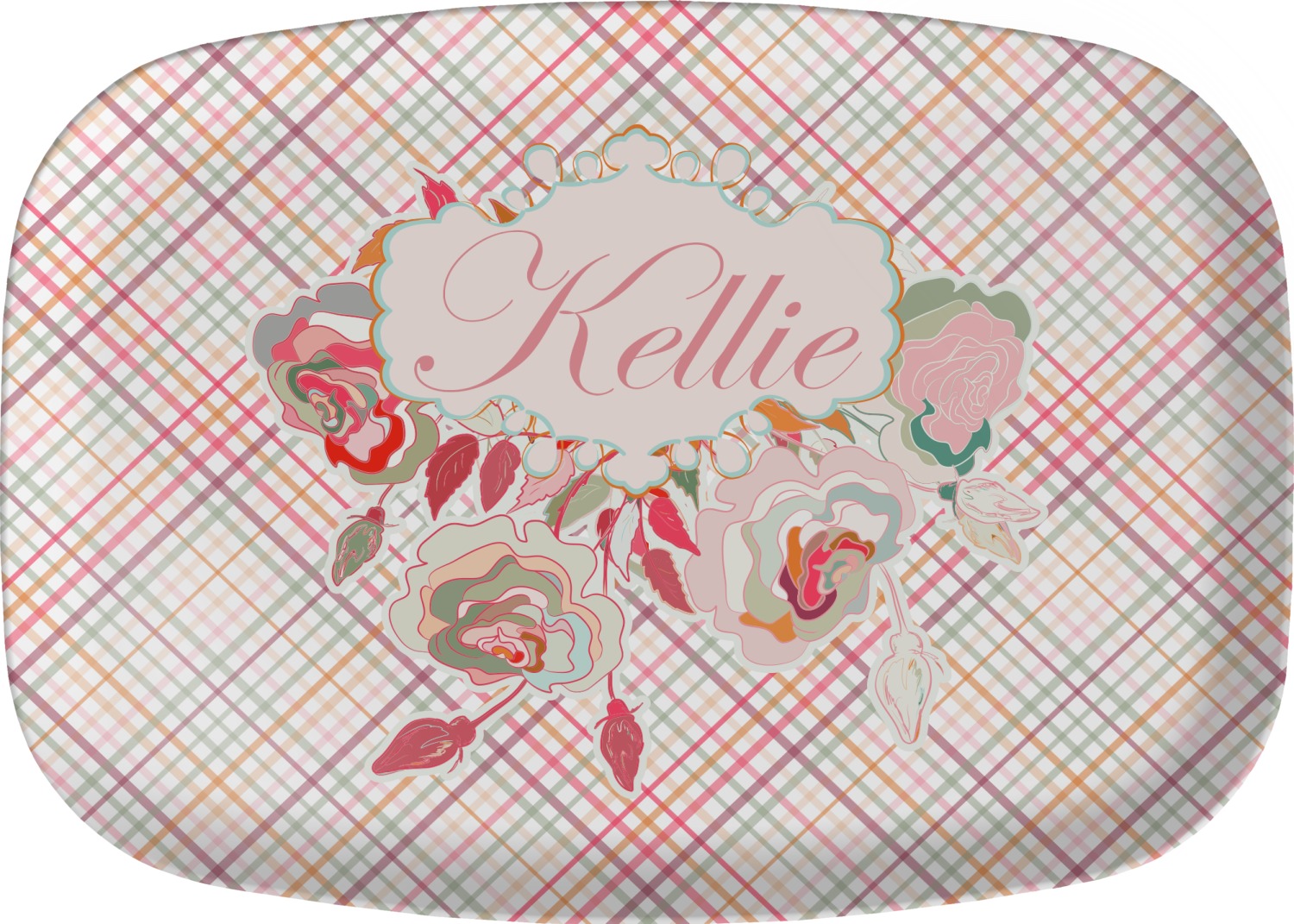 To make it really feminine, we chose a matching floral label that coordinates perfectly with the modern plaid. We chose to use a name personalization in our crown jewels font. We think this is a beautiful elegant design.