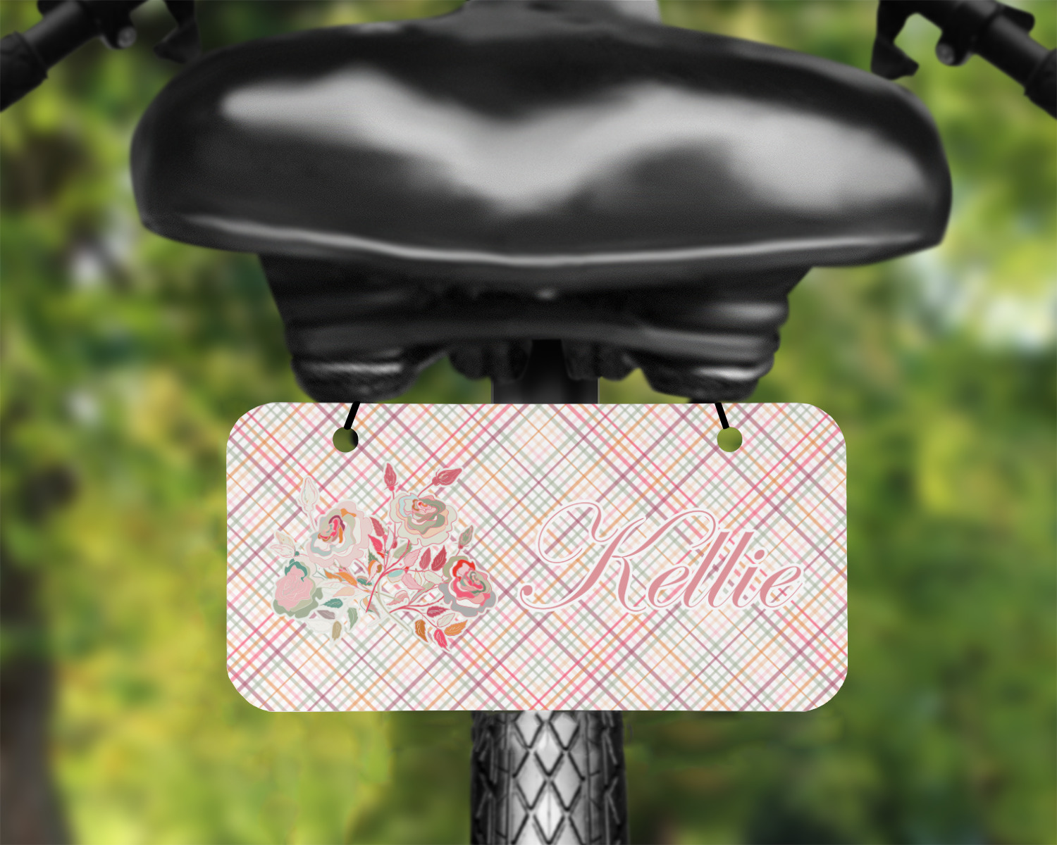 To make it really feminine, we chose a matching floral label that coordinates perfectly with the modern plaid. We chose to use a name personalization in our crown jewels font. We think this is a beautiful elegant design.