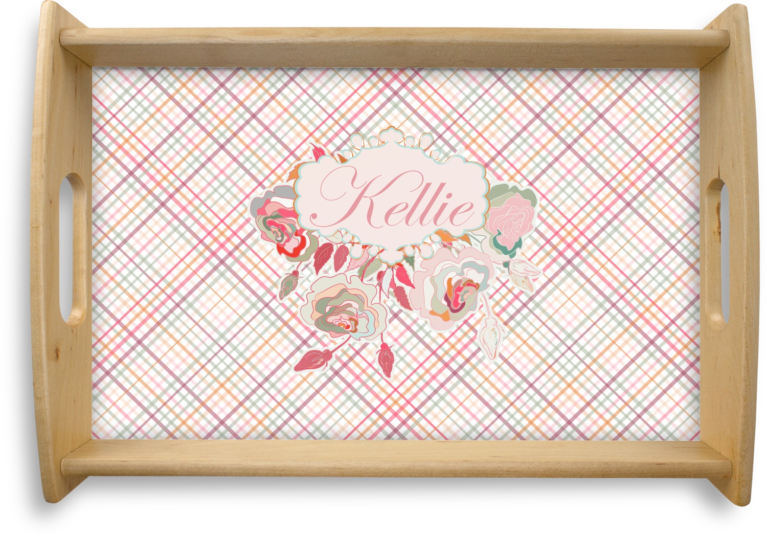 To make it really feminine, we chose a matching floral label that coordinates perfectly with the modern plaid. We chose to use a name personalization in our crown jewels font. We think this is a beautiful elegant design.