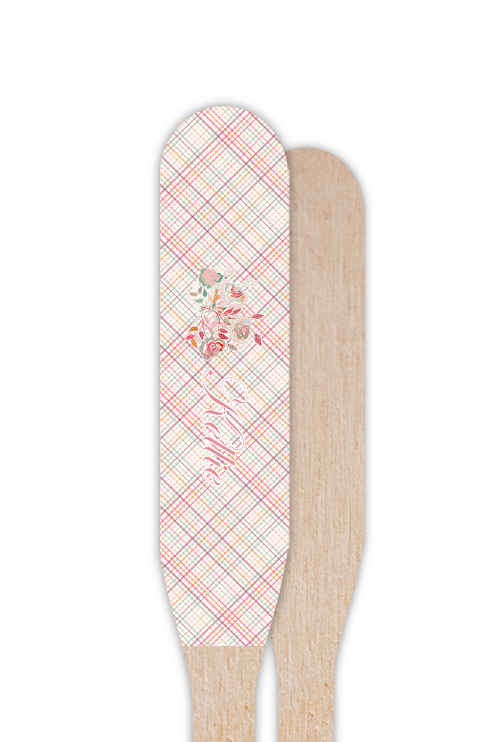To make it really feminine, we chose a matching floral label that coordinates perfectly with the modern plaid. We chose to use a name personalization in our crown jewels font. We think this is a beautiful elegant design.