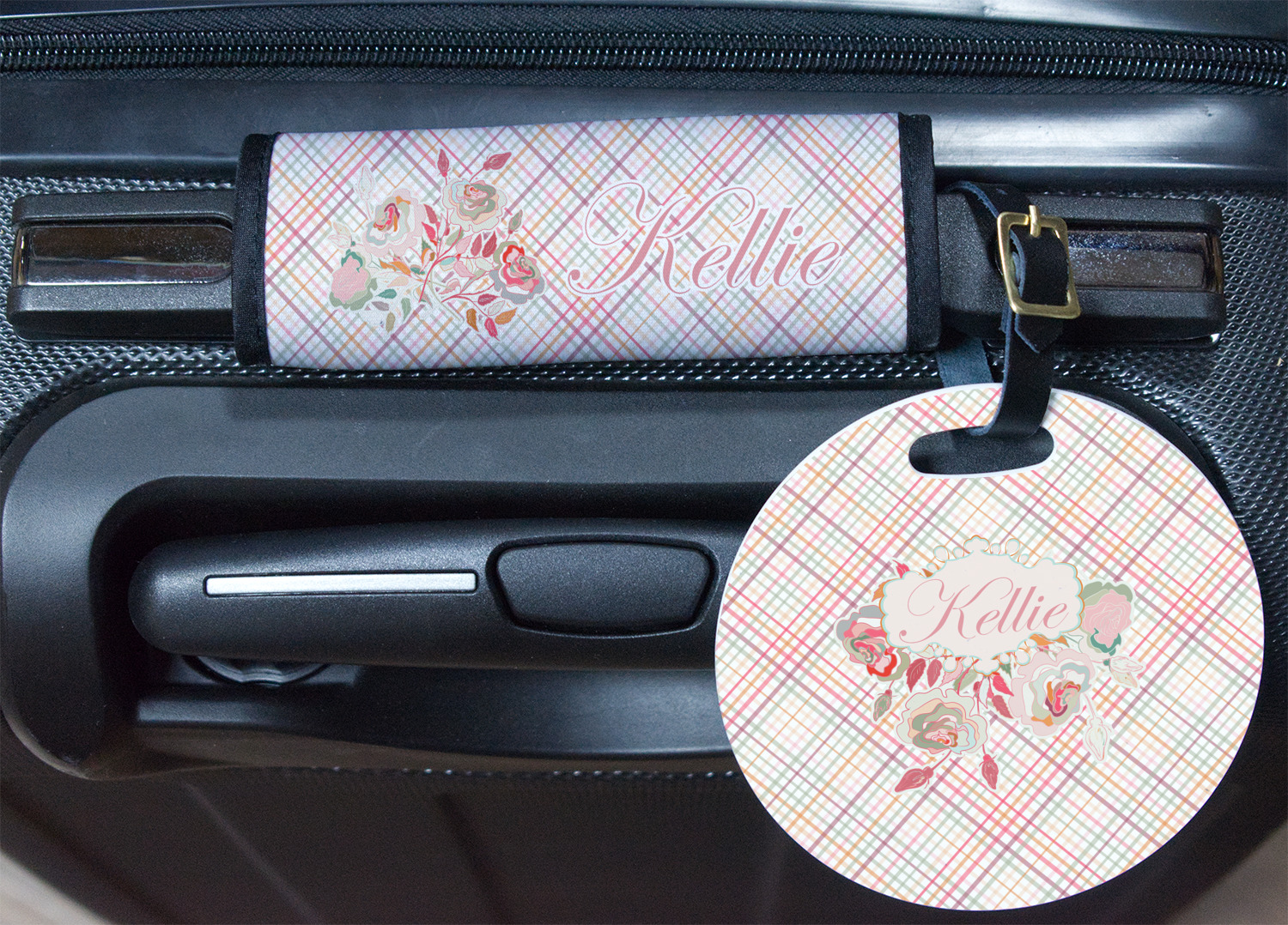 To make it really feminine, we chose a matching floral label that coordinates perfectly with the modern plaid. We chose to use a name personalization in our crown jewels font. We think this is a beautiful elegant design.