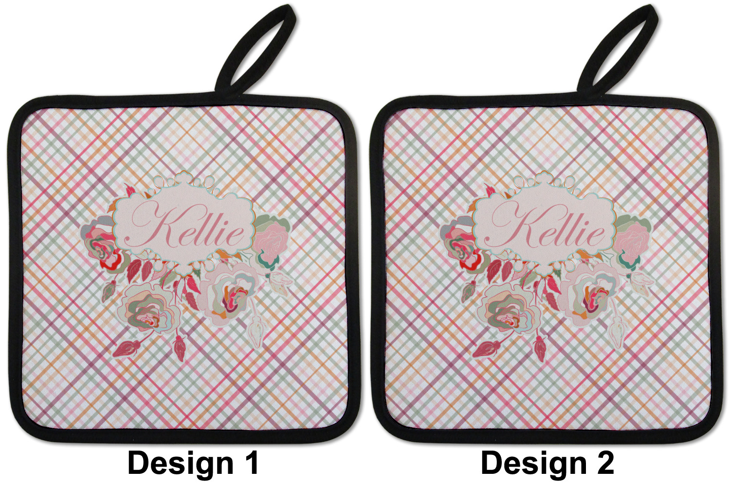 Our personalized pot holders feature a neoprene front that displays your personalization in vibrant colors. The backing of the hot pot holder is rubberized; the textured backing allows you to have a great grip when using this custom pot holder. The two materials are joined with a sleek, black trim, and the holder also includes an attached loop for hanging and storage. The pot holder is approximately 8.75 inches by 8.75 inches and 0.25 inches tall, while the fabric loop is 2.5 inches long. You can purchase a kitchen pot holder by itself or as a set of 2. We also offer a set including one pot holder and one oven mitt.