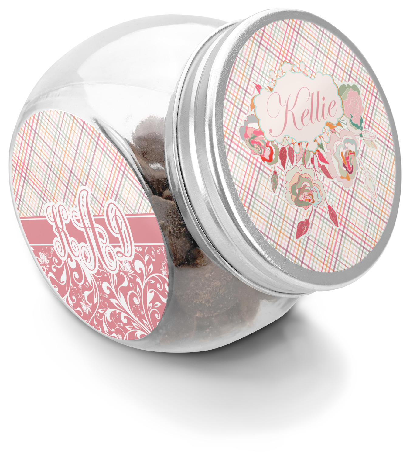 This treat jar is an excellent way to store treats for your favorite canine or feline. Moreover, their delicate, classy appearance makes them a tasteful addition to your countertop's décor. Crafted from clear glass, its unique construction and silver metal, screw-on lid allows for quick and easy access. Three, permanent, vinyl stickers are applied to both sides of the jar and lid, presenting your personalized design. The base of this glass, dog treat jar is 3.4" x 4.75", and the jar stands at 5" tall. Though on the smaller side, this jar is best suited for smaller treats or training treats.