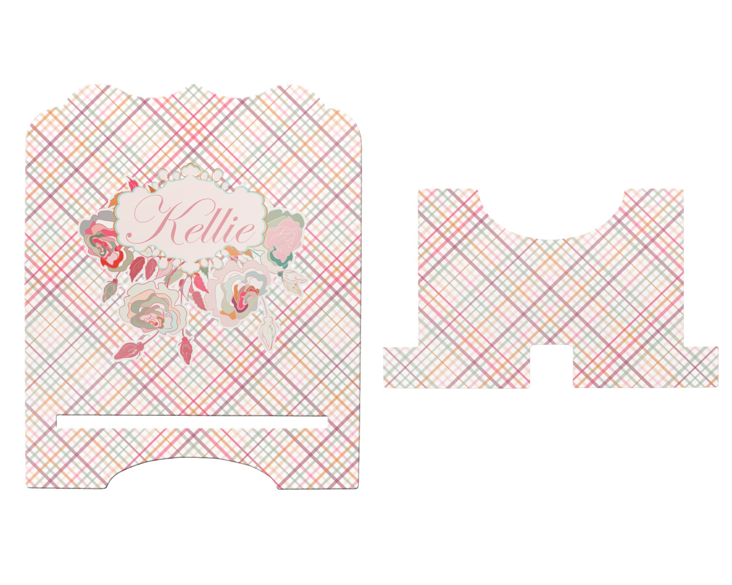 To make it really feminine, we chose a matching floral label that coordinates perfectly with the modern plaid. We chose to use a name personalization in our crown jewels font. We think this is a beautiful elegant design.