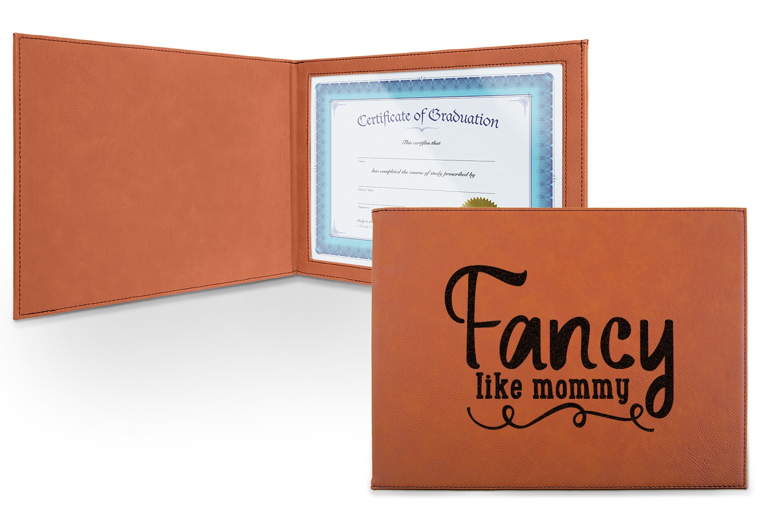 This cognac-colored, leatherette certificate jacket is the ideal way to display or store your hard-earned certificate. When closed, the custom certificate holder measures at 12 by 9 inches. The interior of the certificate cover includes a clear, vinyl window to encase your diploma. The window measures at around 10.5 by 7.5 inches and can accommodate a diploma that measures at up to 8.5 by 11 inches. You can either choose to have your customization laser engraved on the front and interior, or solely the front.
