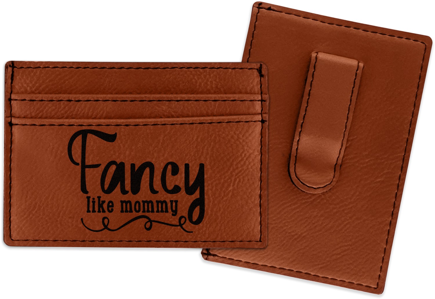 Made from a smooth brown leatherette material, these money clip wallets are the perfect accessory. They measure at approximately 4" x 2.75". On one side there is a money clip where you can slip in your cash. On the other side are three card slots for an ID and credit card or two. The money clip wallet will be laser engraved with your design on the side with the credit card slots. The graphic will come out as a black color.