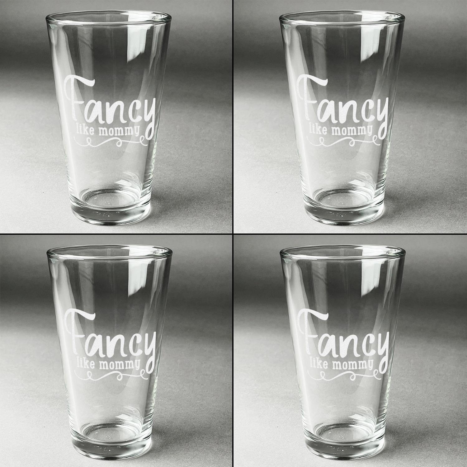 Available in a single glass or a set of 4 - each glass will be custom engraved with your design. Each glass holds 16 oz and measure 5.75"H x 3.5"W.