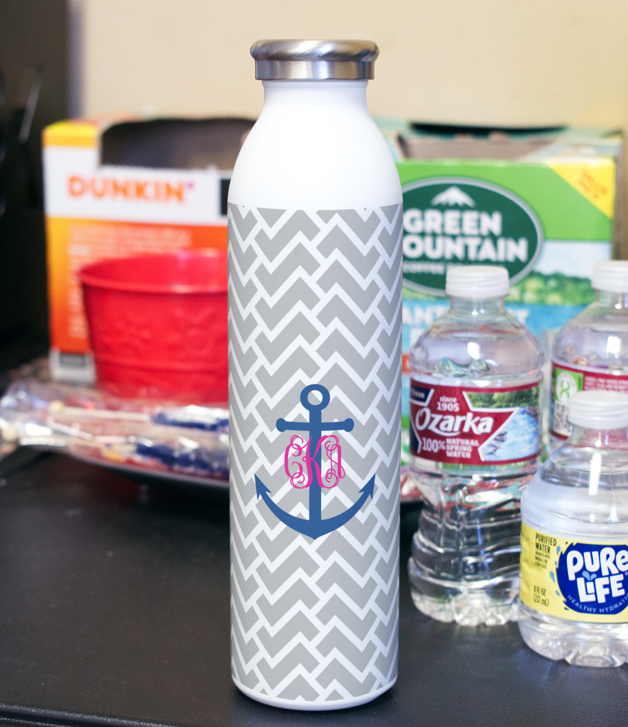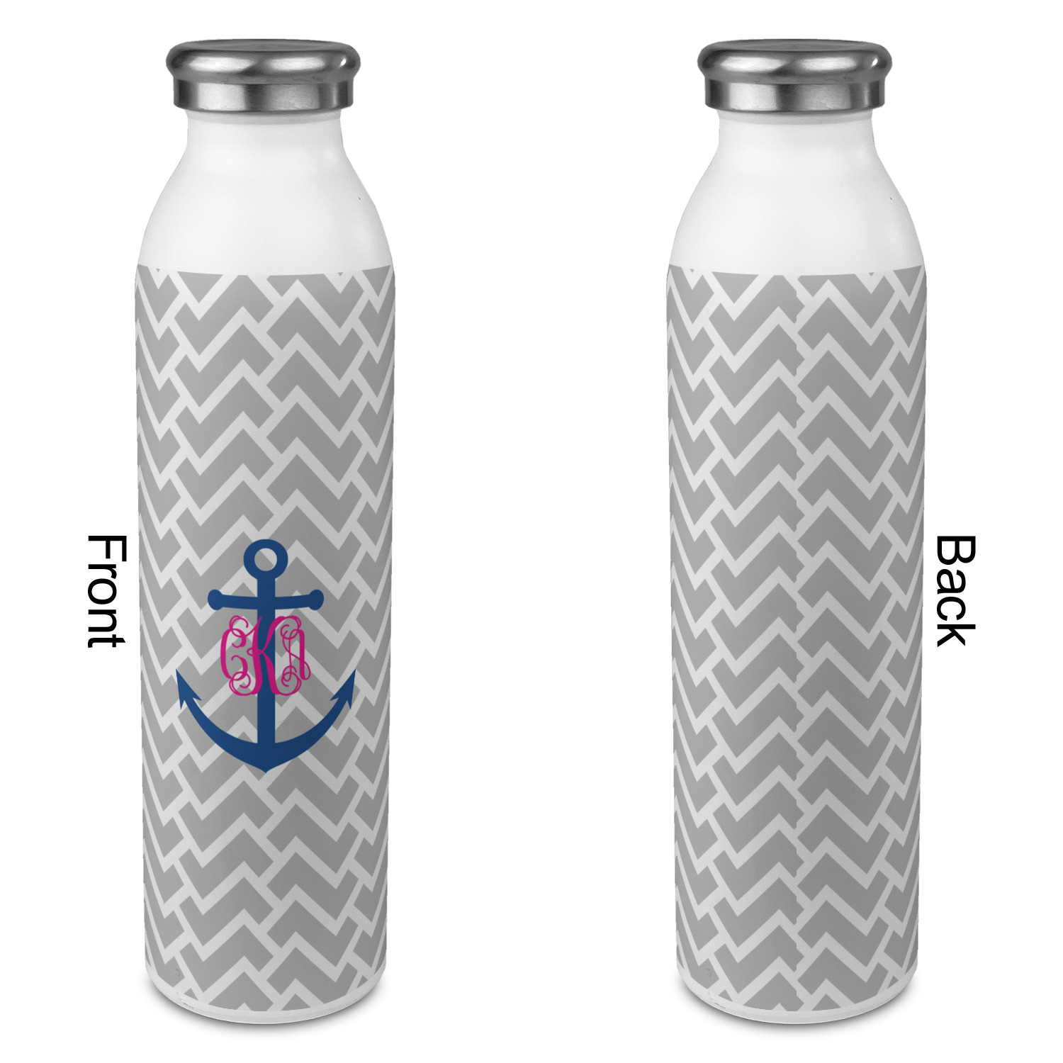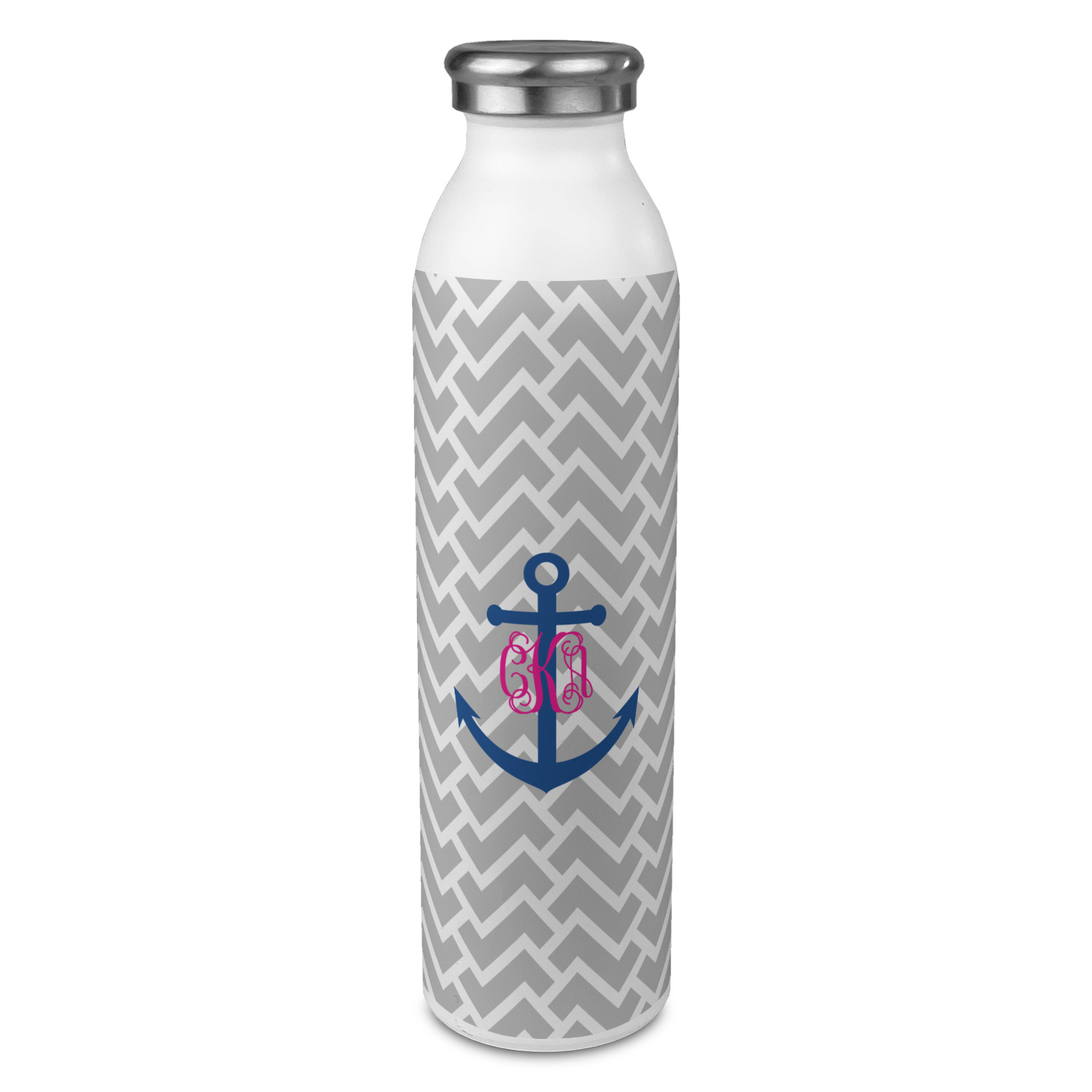 This design perfect for someone who loves anchors and monograms. In this beautiful design, we features a zigzag pattern for the background. We chose a neutral light gray color. For the foreground we chose a simple anchor in blue and we added an interlocking monogram in hot pink on top of the anchor.