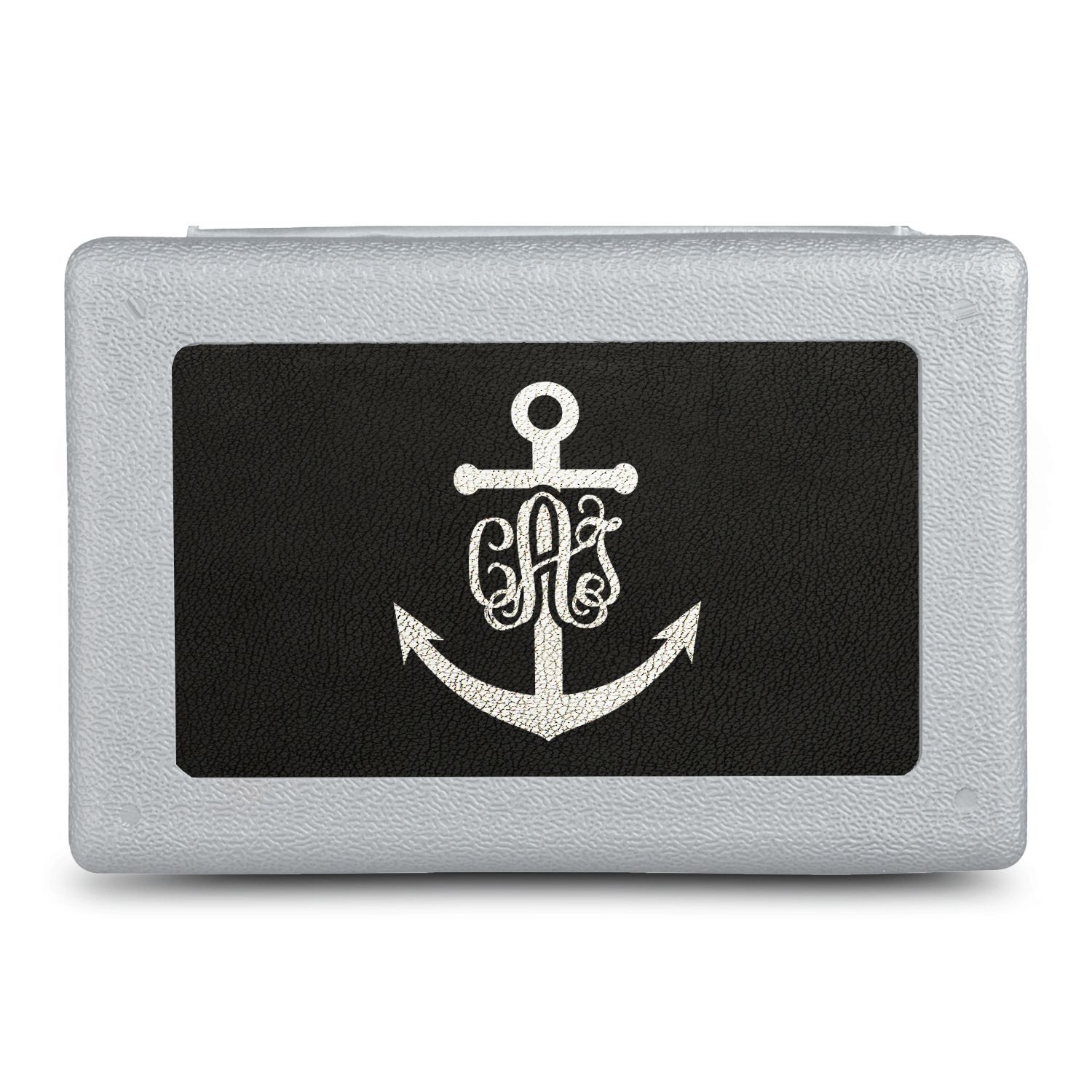 This design perfect for someone who loves anchors and monograms. In this beautiful design, we features a zigzag pattern for the background. We chose a neutral light gray color. For the foreground we chose a simple anchor in blue and we added an interlocking monogram in hot pink on top of the anchor.