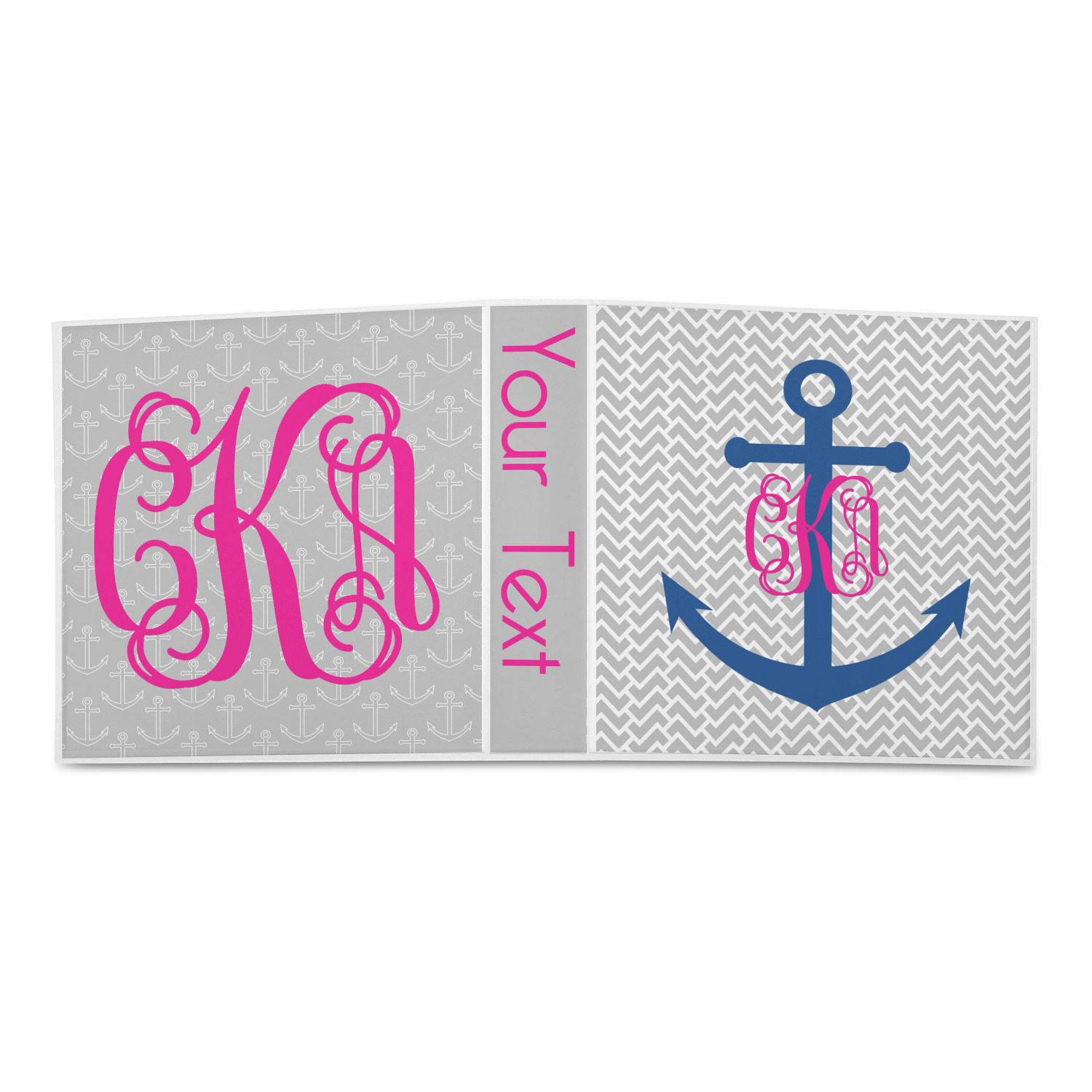 This design perfect for someone who loves anchors and monograms. In this beautiful design, we features a zigzag pattern for the background. We chose a neutral light gray color. For the foreground we chose a simple anchor in blue and we added an interlocking monogram in hot pink on top of the anchor.