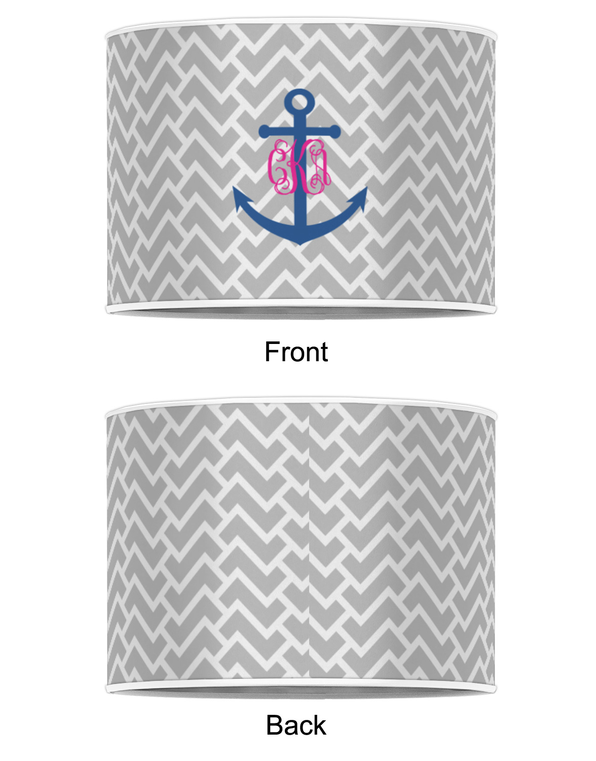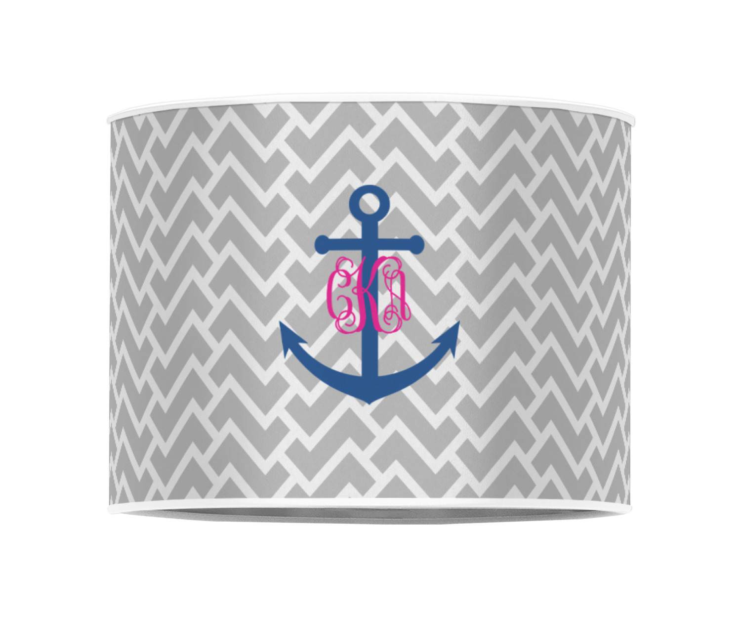 This design perfect for someone who loves anchors and monograms. In this beautiful design, we features a zigzag pattern for the background. We chose a neutral light gray color. For the foreground we chose a simple anchor in blue and we added an interlocking monogram in hot pink on top of the anchor.