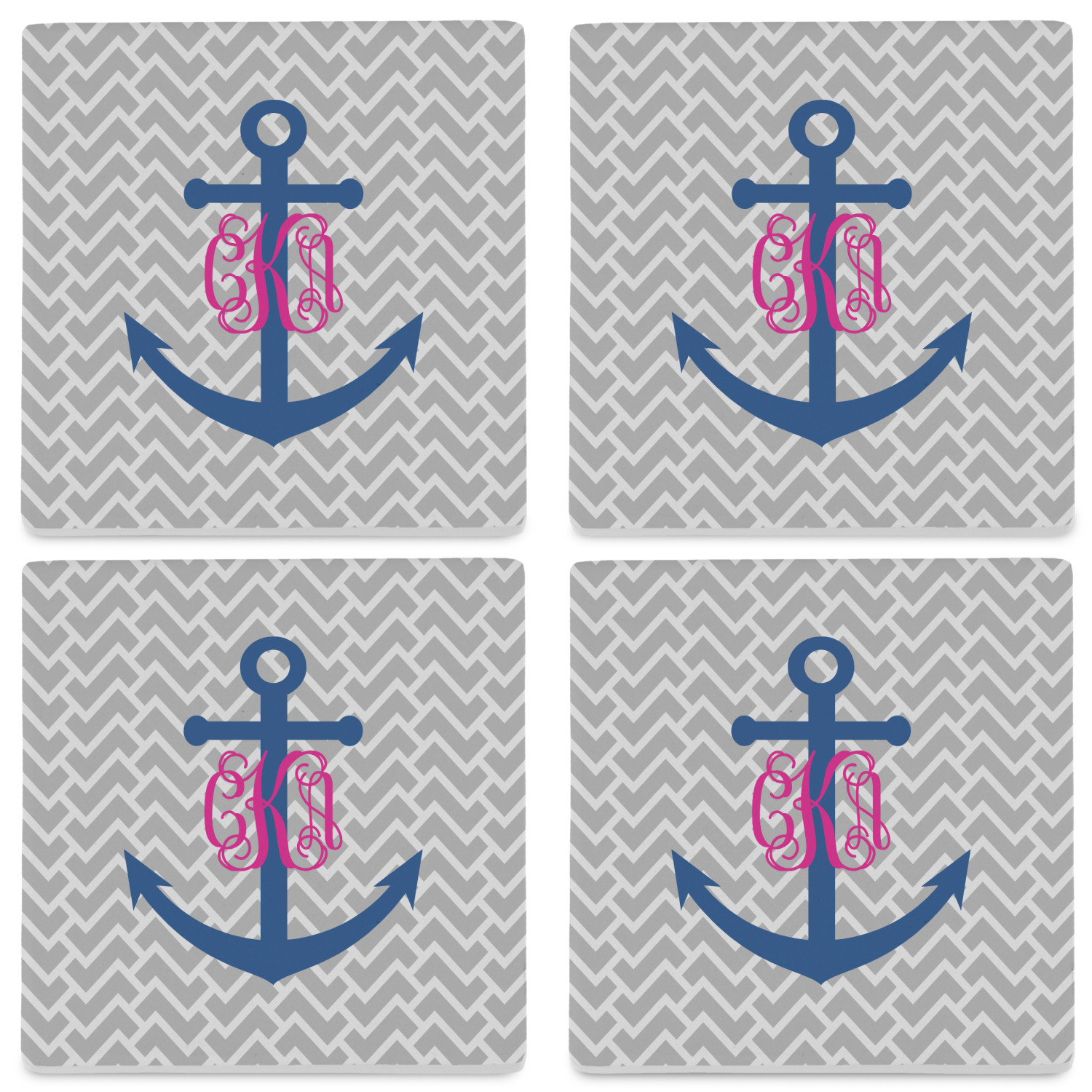 This design perfect for someone who loves anchors and monograms. In this beautiful design, we features a zigzag pattern for the background. We chose a neutral light gray color. For the foreground we chose a simple anchor in blue and we added an interlocking monogram in hot pink on top of the anchor.