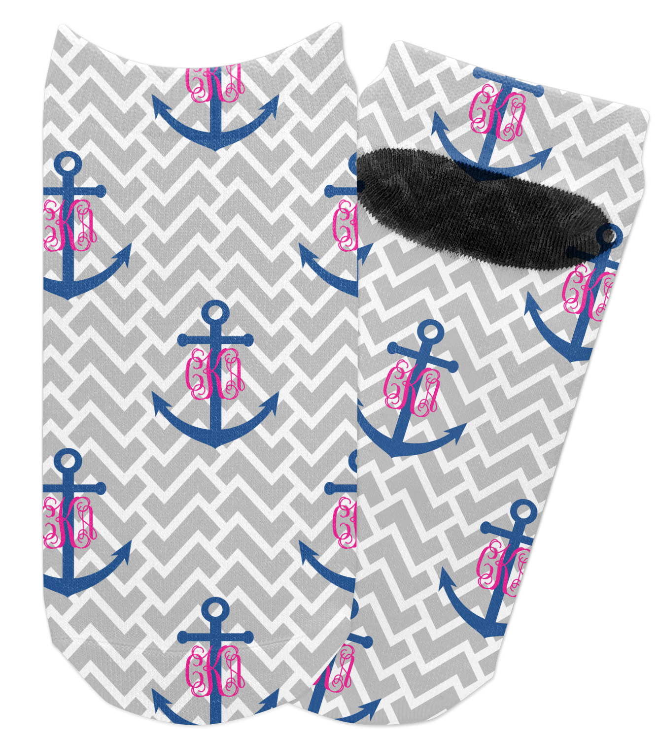 This design perfect for someone who loves anchors and monograms. In this beautiful design, we features a zigzag pattern for the background. We chose a neutral light gray color. For the foreground we chose a simple anchor in blue and we added an interlocking monogram in hot pink on top of the anchor.