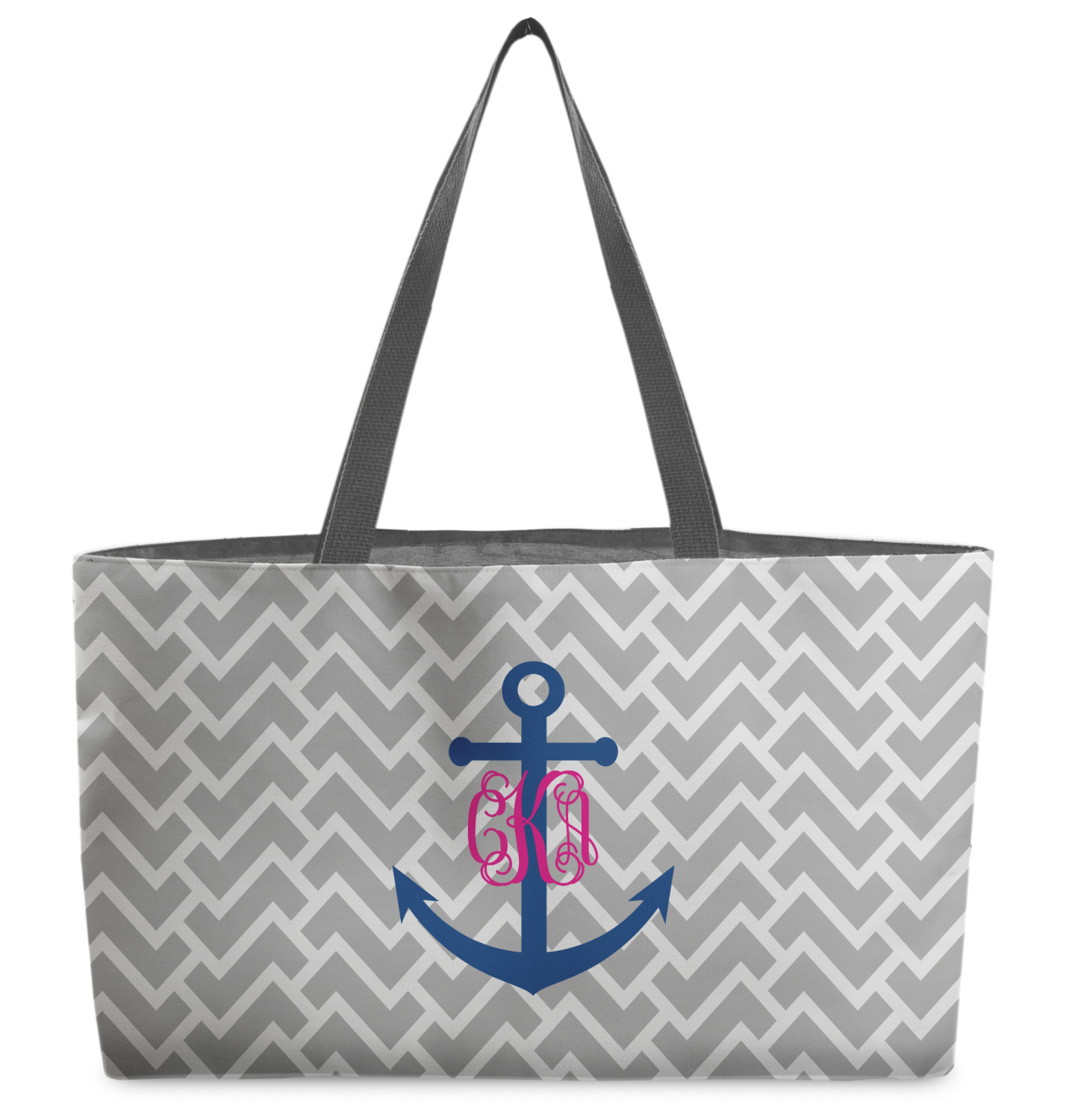This design perfect for someone who loves anchors and monograms. In this beautiful design, we features a zigzag pattern for the background. We chose a neutral light gray color. For the foreground we chose a simple anchor in blue and we added an interlocking monogram in hot pink on top of the anchor.