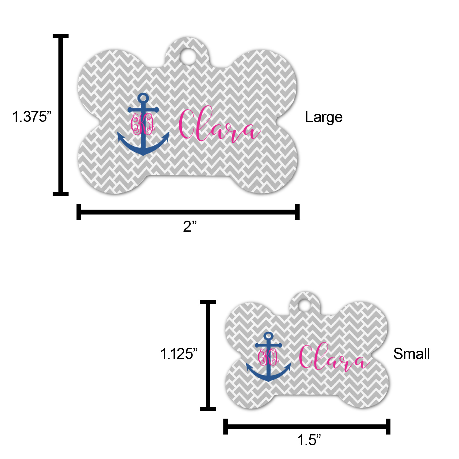 The small bone dog tag size is perfect to pair with our small dog collars, the large size pairs well with our large dog collars.