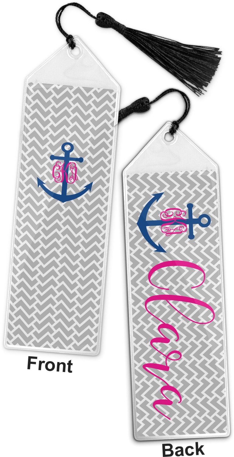 Your personalized bookmark is made of a sturdy, clear vinyl, and is approximately 7.5" x 2.25". We display your personalization on vinyl inserts that are placed on both sides. Accompanying each book marker is a black, fringe tassel that attaches to the reinforced, triangular header.
